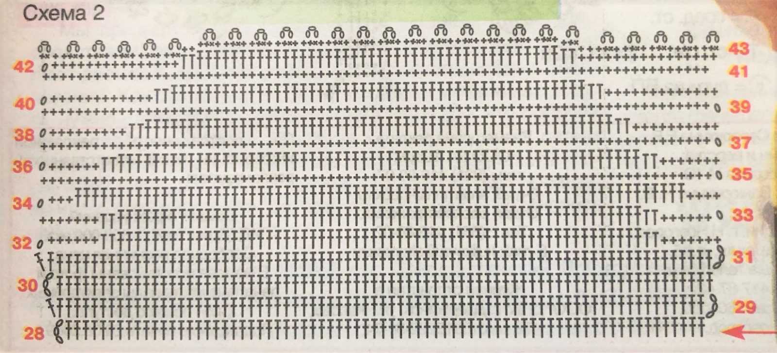 Наберите меланжевой нитью цепочку из возд. п. длиной 56 см. Вяжите по схеме 1 реглан по кругу. Через 6 см свяжите по кругу кайму по схеме 2, выполняя прибавления на углах, как показано на схеме 2а.