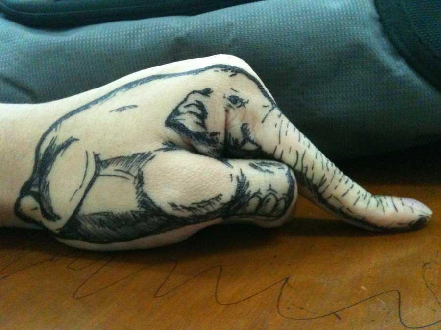 Слон — его можно довольно интересно разместить на руке таким образом, чтобы ноги и хобот приходились на пальцы. Это животное воплощает верность, мудрость. Особым почётом он пользуется в Индии как воплощение Ганеши — бога счастья. Для мужчин подобная татуировка является идеальной, соединяя в себе физическую мощь и разум.
