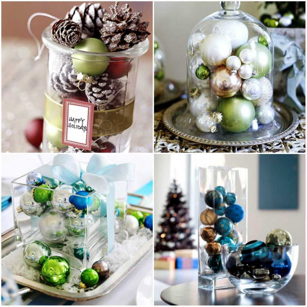 Очень красиво и стильно будет смотреться композиция из ярких, блестящих елочных шаров, уложенных в вазу из прозрачного стекла. Дополнительными элементами подобной композиции послужат небольшая елочка, самодельные снежинки или еловая ветвь.