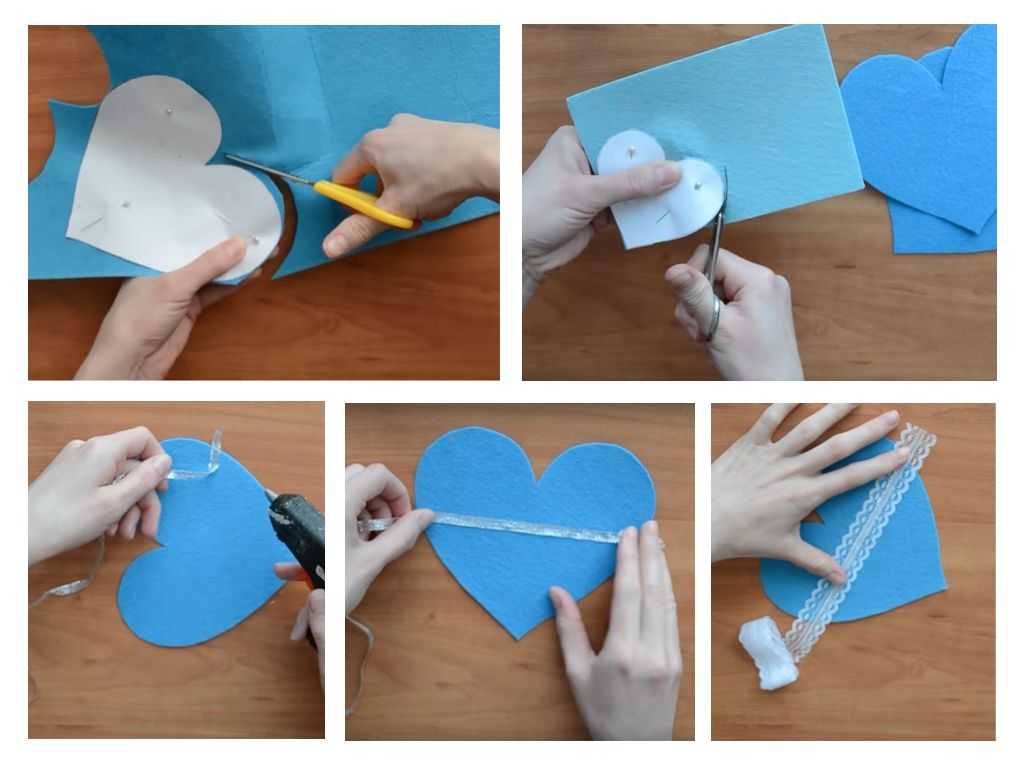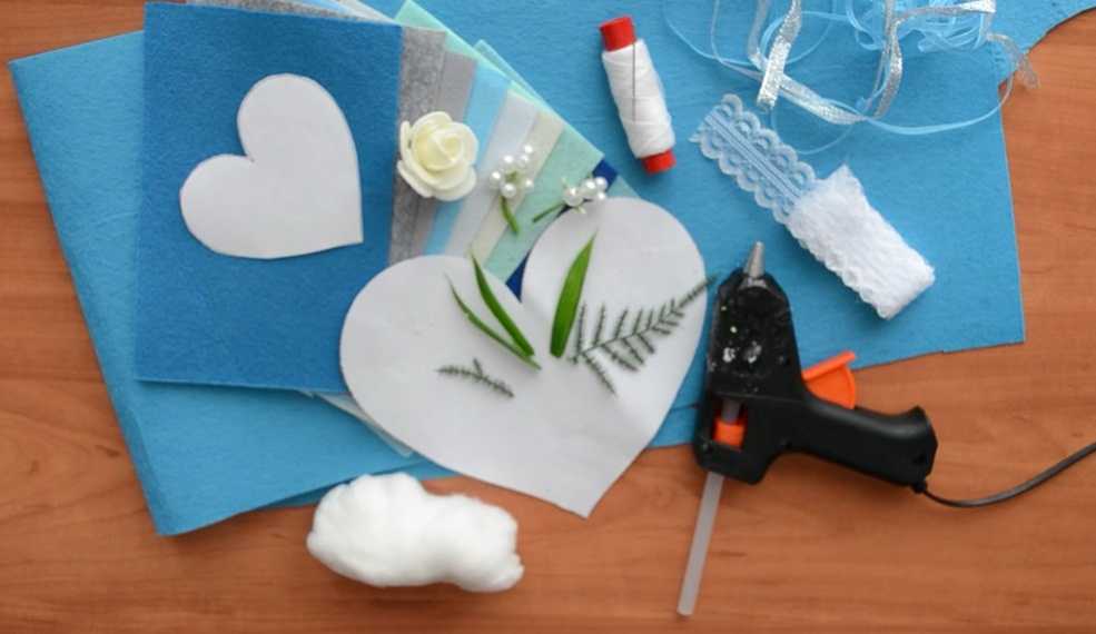 Это то, что нам понадобится: Фетр, шаблоны сердца, клеевой пистолет, атласные и кружевные ленты, элементы декора, нитки с иголкой, ножницы, вата для наполнения.