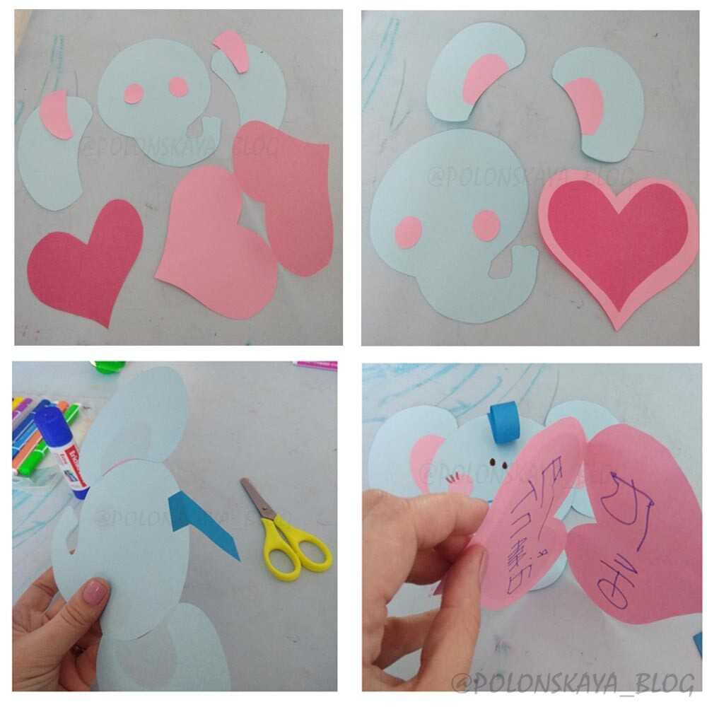 3. Для этой валентинки понадобится белая и цветная бумага, штампики в виде сердечек или можно нарисовать их фломастерами.