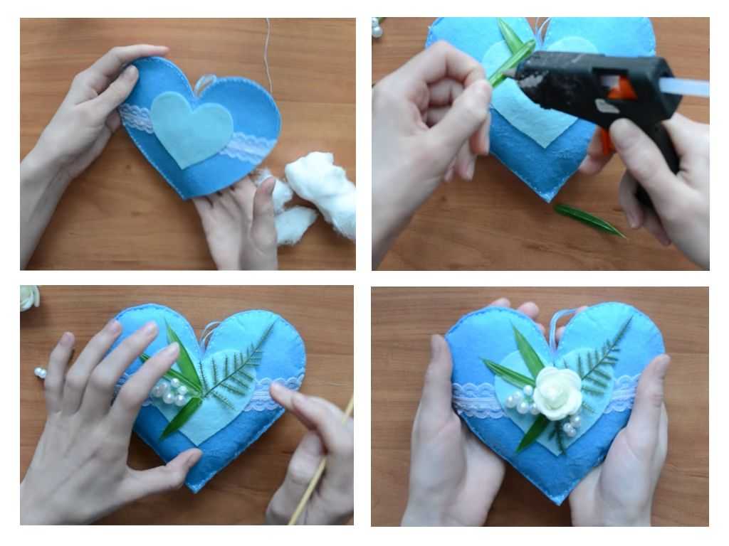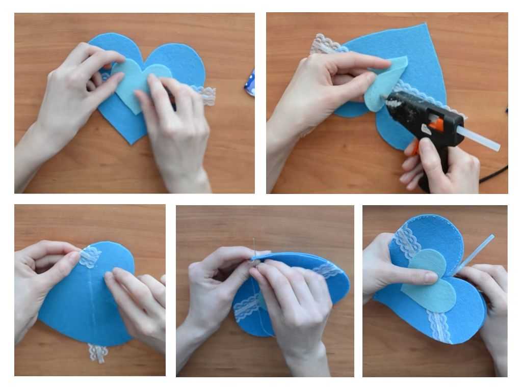 Возьмите второе сердце, иголку с ниткой и сшейте вместе детали. Пришейте петельку.