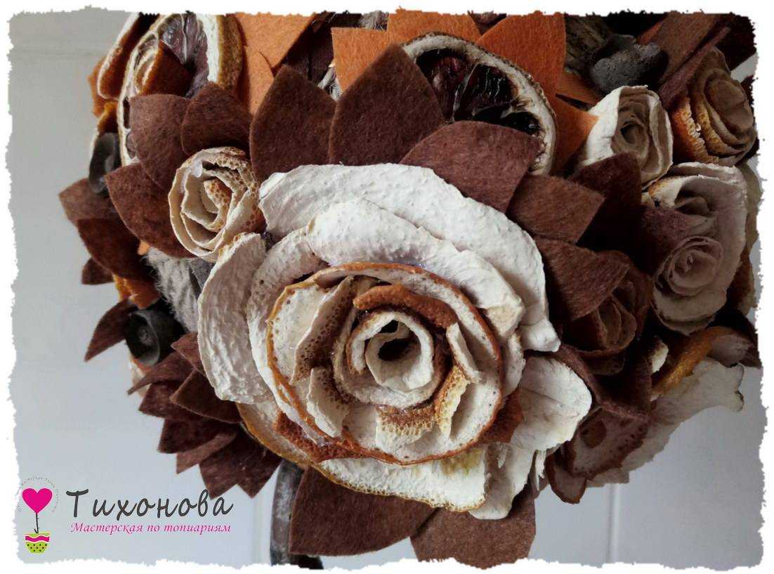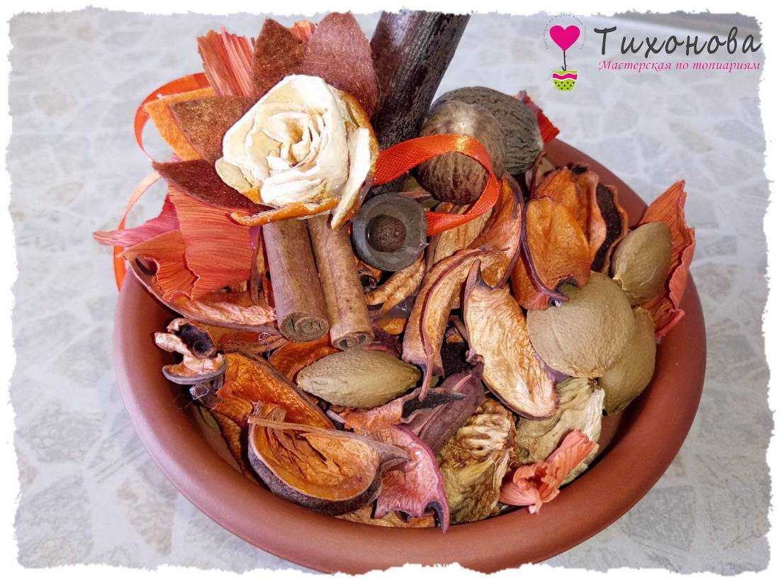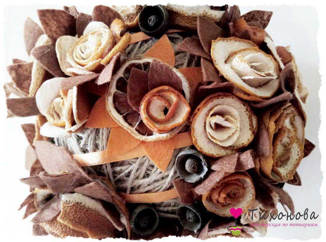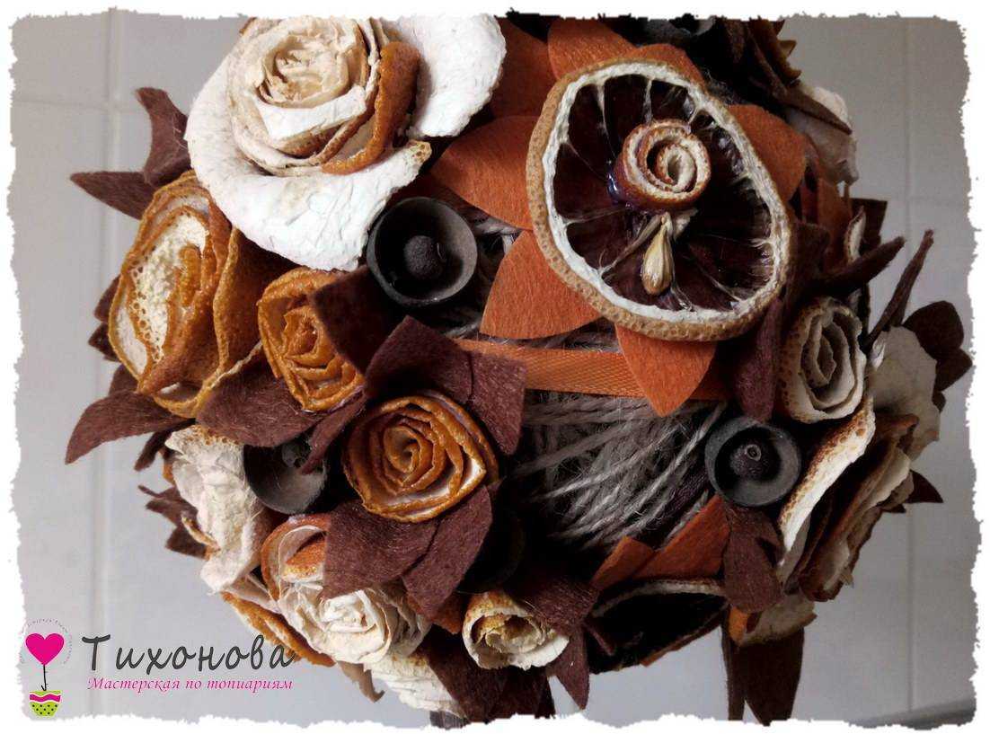 Все вышеперечисленное априори сочетается между собой, и при минимальных умениях используется для создания: осенних букетов из природных материалов, панно, венков, топиария.