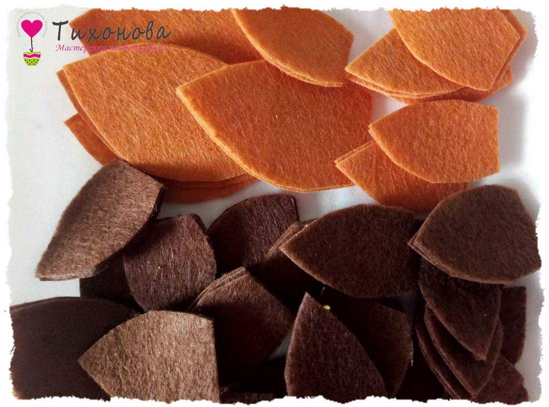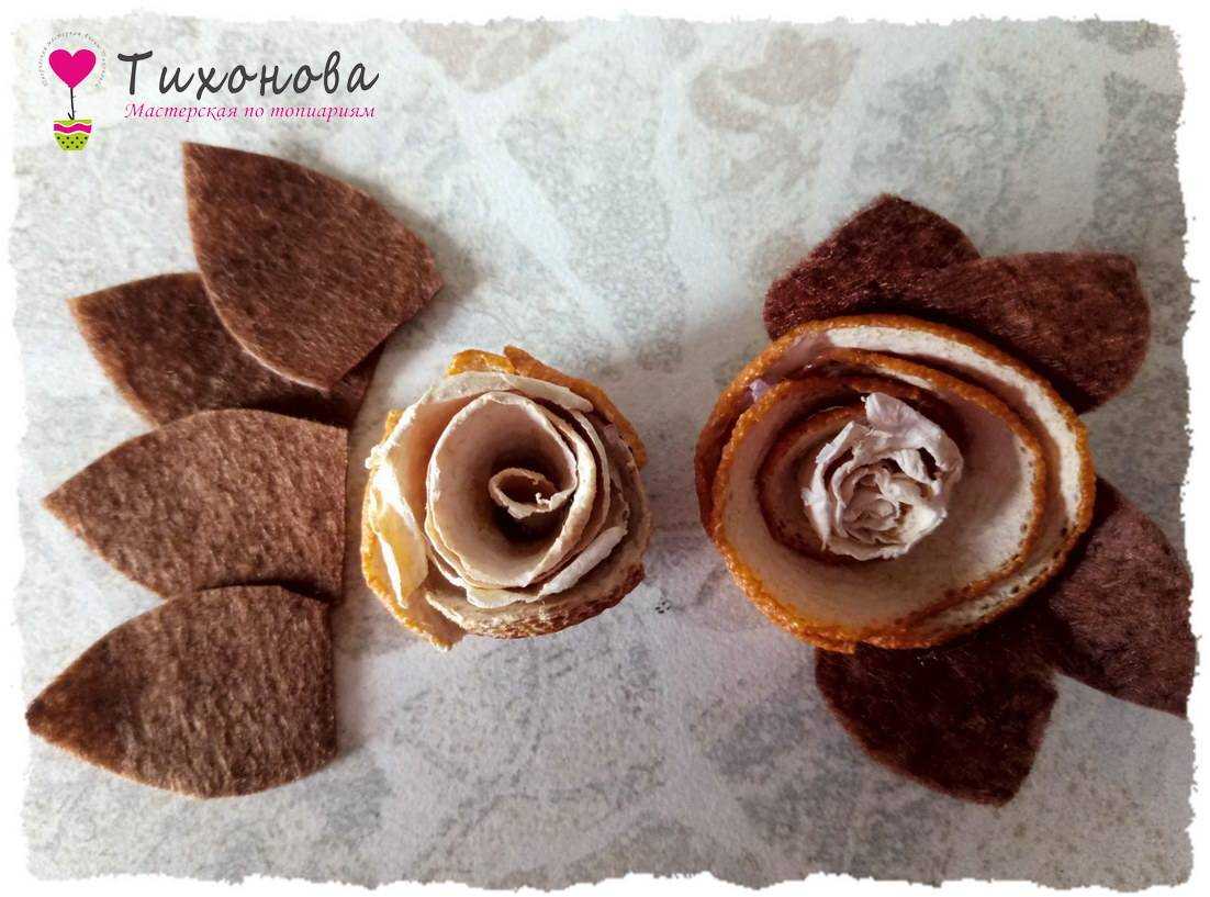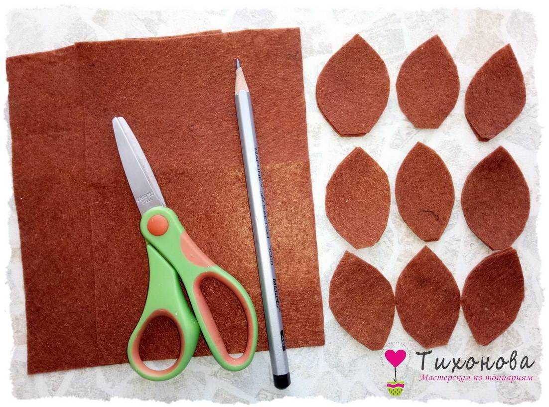 По кругу прикрепляйте листья на основу, закручивая на ней черенок листика.