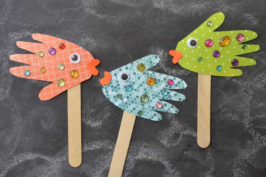 Для этой поделки понадобятся 2–3 листа плотной бумаги разного цвета, палочки от мороженого и декор (бусинка, пайетки или стразы).