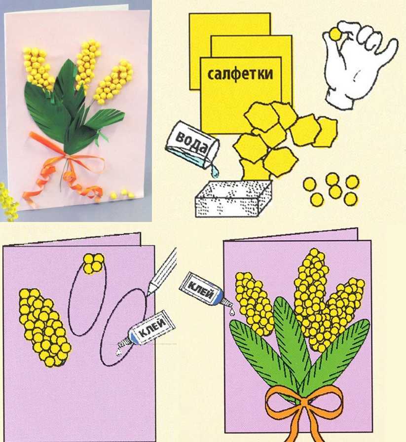 Делать поделки к 8 марта лучше всего из подручных материалов. Возьмите цветную бумагу, например, гофрированный материал хорошо подходит для объемных открыток. Или познакомьте детей с техникой квиллинга.