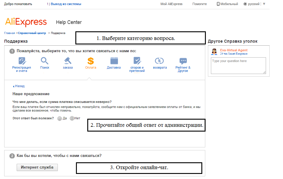 Если, прочитав всю информацию, вы не нашли нужный ответ, можно обратиться к виртуальной Еве, она находится в правом нижнем углу страницы . Робот Ева работает в течение 24 часов, вопросы ей задаются на английском языке. При решении сложных конфликтов, жалобе на продавца, Ева помочь не сможет, принцип ее работы заключается в поиске совпадения вашего вопроса среди всей информации на сайте.