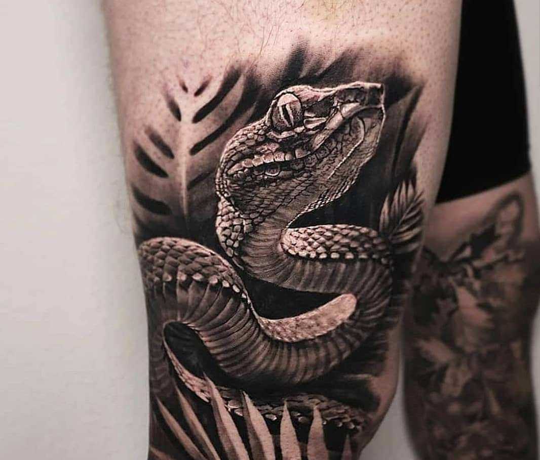 У мужчин данный тип татуировок отличается размерами и масштабностью. Иными словами, парни любят разрисовать практически всю ногу. Достаточно часто можно встретить мужские тату на голени, которые наносятся как сзади, так и спереди ноги. Несмотря на боль, парни выбирают масштабные и реалистичные изображения. Большую популярность в этой области имеет стиль «блэкворк», отличающийся своей брутальностью и простыми формами. Такие нательные рисунки наносятся исключительно черным пигментом, а некоторые участки или элементы татуировки полностью им закрашиваются.