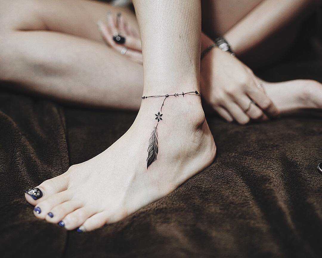 Эти аксессуары наносят романтичные натуры, которые хотят украсить щиколотки необычным образом. Часто, к цепочке добавляют перья, бусины или кресты.