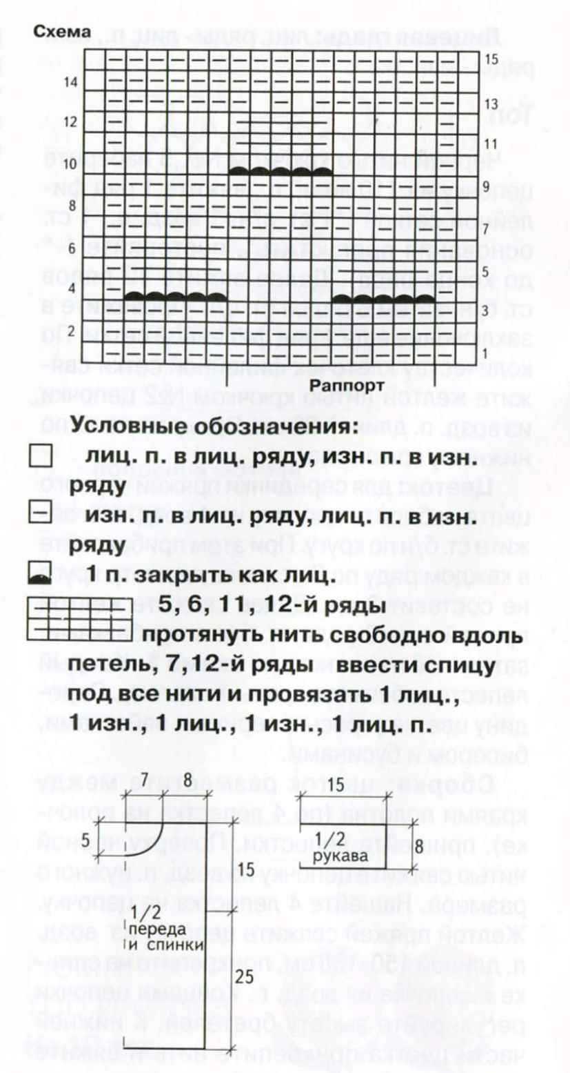 Плотность вязания: гладь лицев. спицы номера 4–22 петл.х32 ряд.=10×10 сантиметров; Узор Большой Жемчужный спицы номера 4–23 петл.х34 ряд.=10×10 сантиметра.