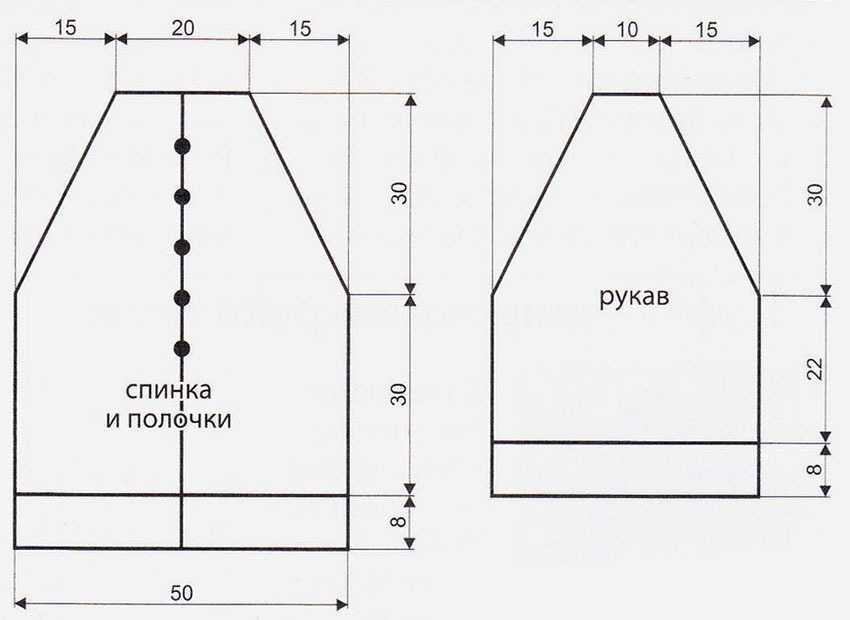 - Рукава делают по выкройке, как на рисунке сверху, примерная ширина рукава равняется 62 петлям. Вначале надо оформить низ деталей около 9-ти сантиметров платочным узором, а потом провязывают петли лицевой гладью. Для стандартных размеров достаточно так провязать около двадцати сантиметров. После начинают убавлять петли с двух сторон, чтобы оформить скос реглана. Длина такого скоса может варьироваться в пределах 30-37 сантиметров. Вверху надо оставить десять сантиметров для оформления плечевого среза.