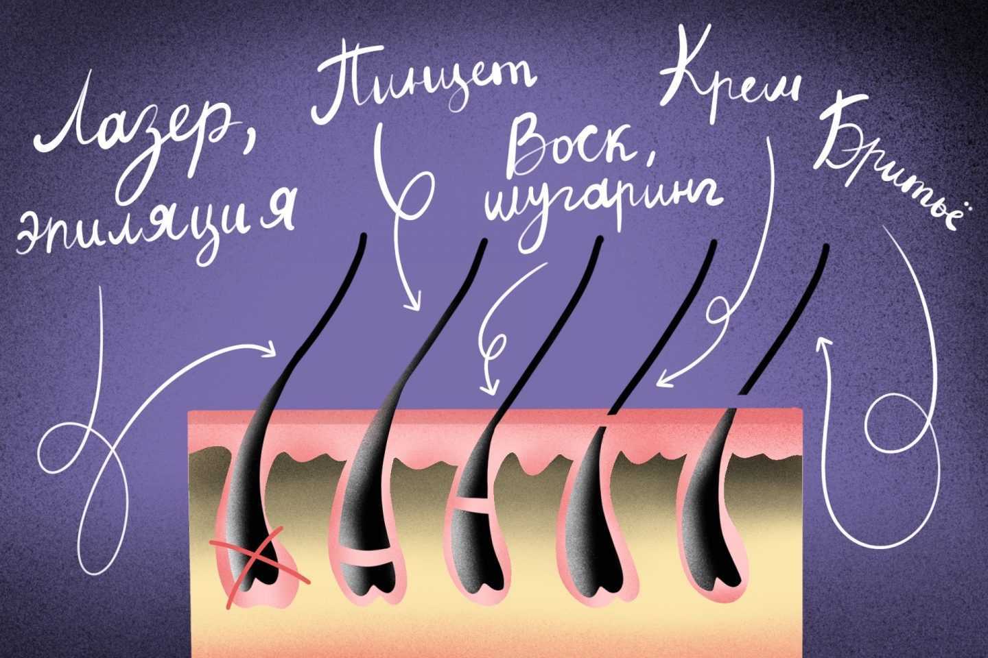 При выщипывании волосяной фолликул отрывается у основания. Потребуется 6–8 недель на то, чтобы отрастить волосок. Если убирать волосы с помощью воска или сахарной пасты, результата хватит на 2–3 недели, но всё зависит от конкретной зоны и ваших особенностей роста волос. Крем для депиляции убирает их примерно на 2 недели, а повторно бриться иногда приходится уже через 12 часов, ведь во время бритья удаляется лишь видимая часть волосяного фолликула.