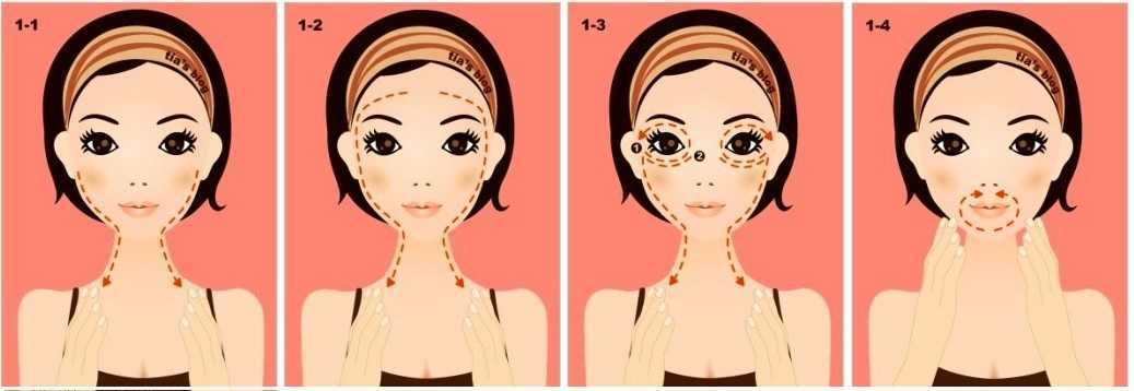 - Поглаживания. Осуществляются по специальным линиям во избежание растяжения кожи: вдоль лба, от уголков глаз к вискам, от линии носа к вискам, от середины подбородка к мочкам ушей, в области шеи, плеч и предплечий. После завершения цикла он повторяется в обратном порядке.
