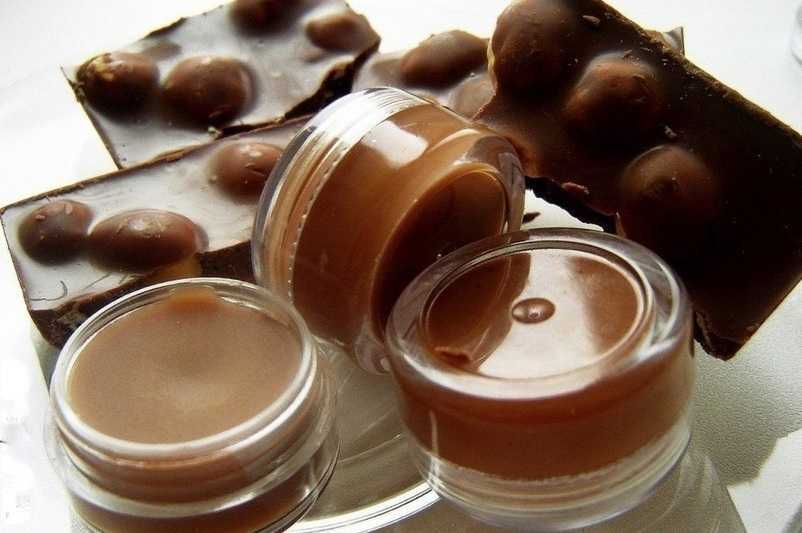 На плите растапливают масло какао и пчелиный воск, после добавляют шоколадную крошку, а уже затем кладут другие маслянистые экстракты. В конце вводят глицерин и эфирное масло, взбивают блендером и разливают по формам. Получается бальзам с насыщенным шоколадно-миндальным ароматом с мятными нотками.