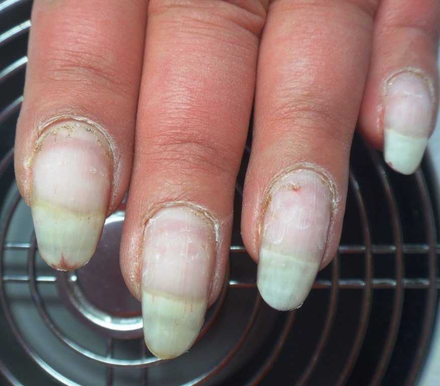 Отслоение ногтя образуется только скраю пластины. Оно может возникать на одном из пальцев, не распространяясь на соседние фаланги. Причина этого в следующих явлениях: