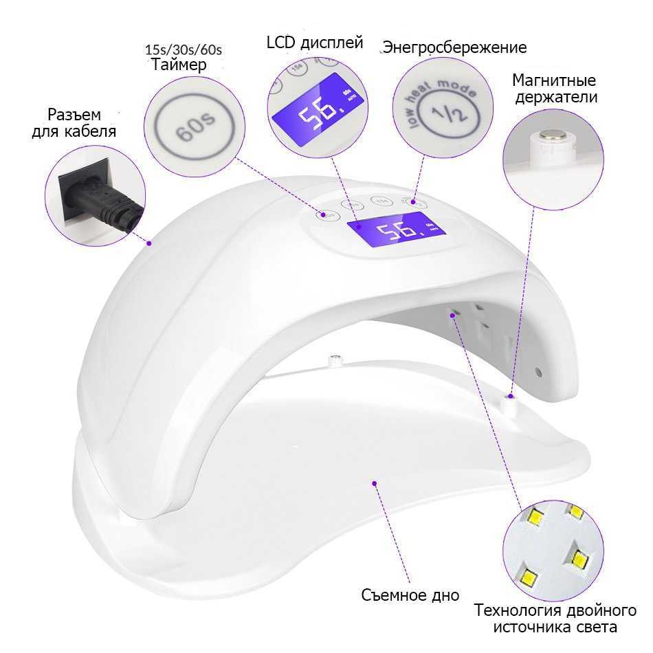 Такие лампы подходят для работы с любыми материалами для декоративного покрытия ногтей – гель-лаки, биогели, шеллак, перманентные лаки. Срок эксплуатации аппарата – до 50 тысяч часов, корпус оборудован таймером – можно выставить на 30, 60 и 120 секунд непрерывного светового излучения.