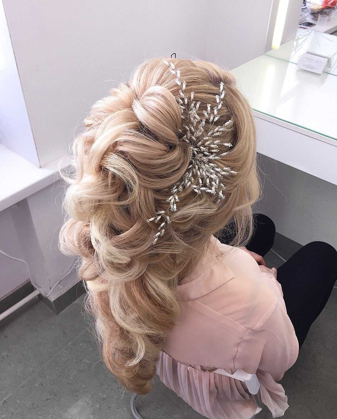 - Постепенно освобождать новые пряди, завивать их, распушать и укладывать на косу, переплетая между собой и закалывая шпильками.