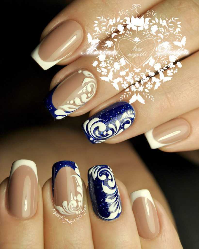 Изящно и нежно смотрится френч в сочетании с вензелями, блестками и стразами.