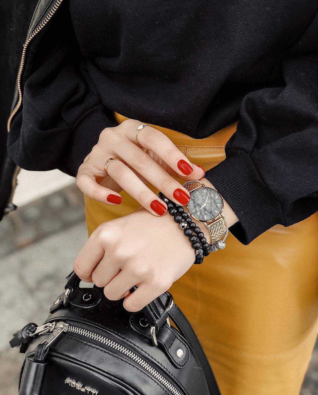 - аксессуары контрастных оттенков в руках — кожаные сумки, клатчи;