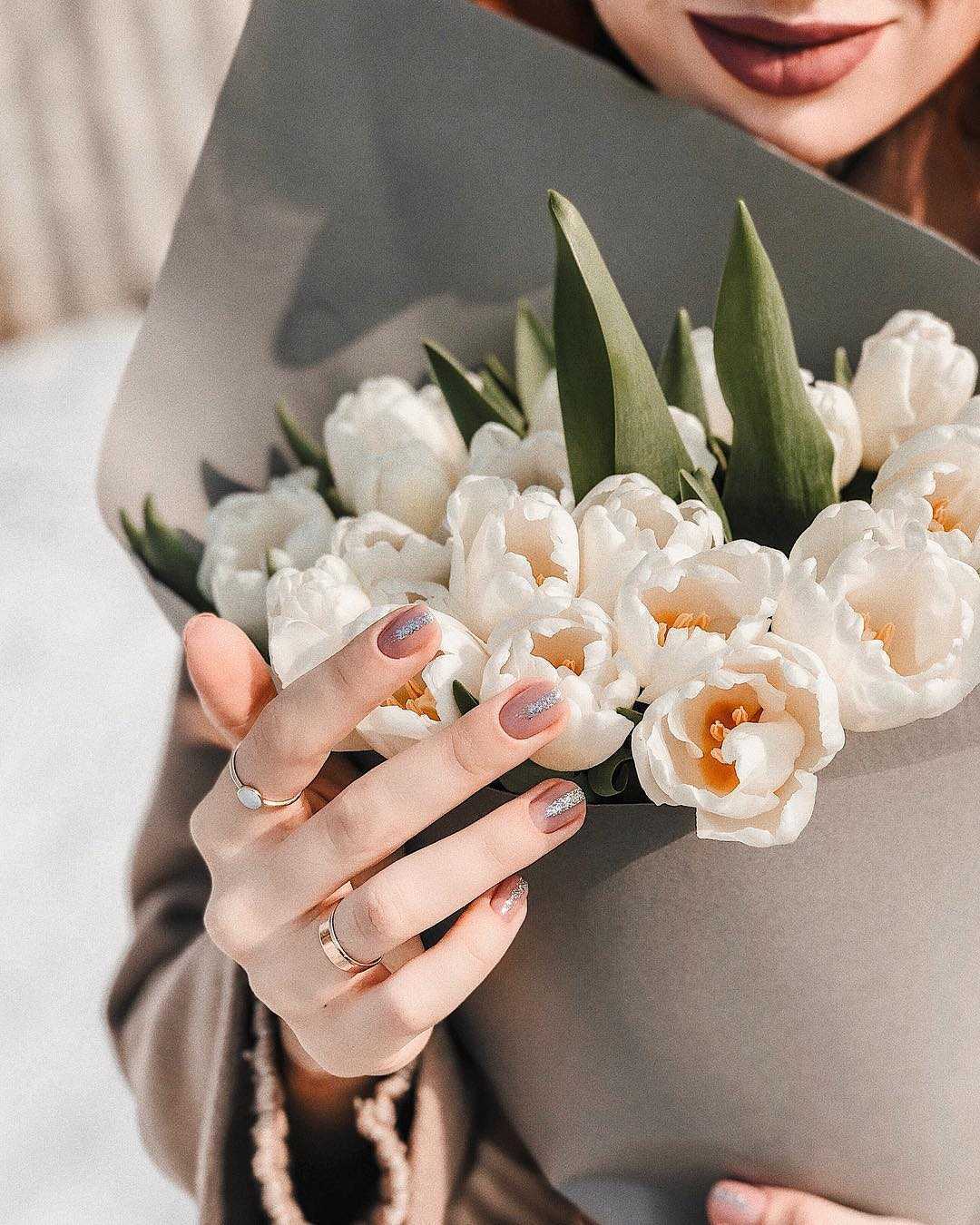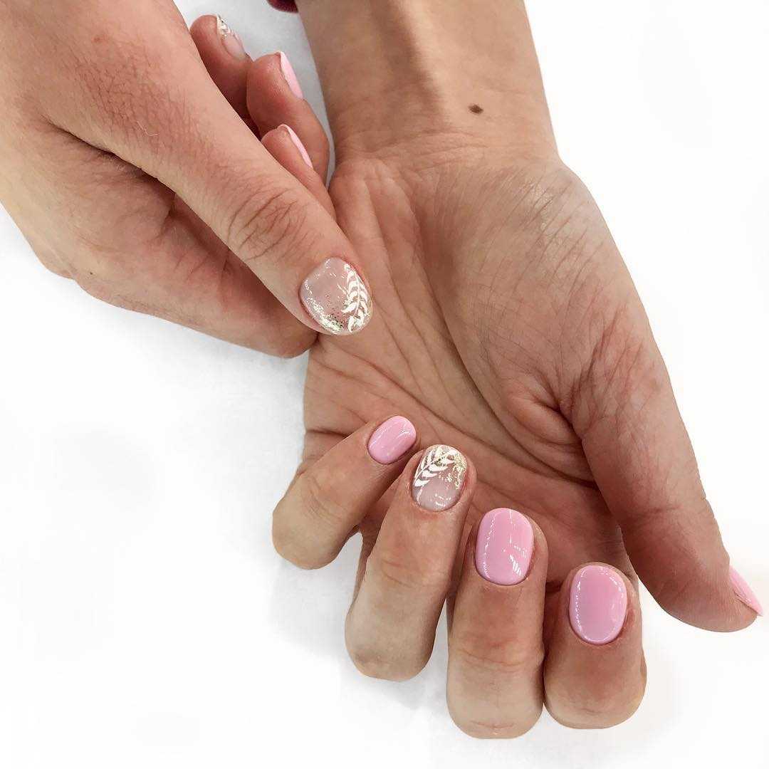 - Для маникюра в светлых пастельных тонах можно использовать растения. Это могут быть как живые цветы с зелеными листьями, так и веточки сухого хлопка. Подойдут интересное сухоцветы. Наиболее популярный вариант — это применение в качестве фото-фона модных журналов.