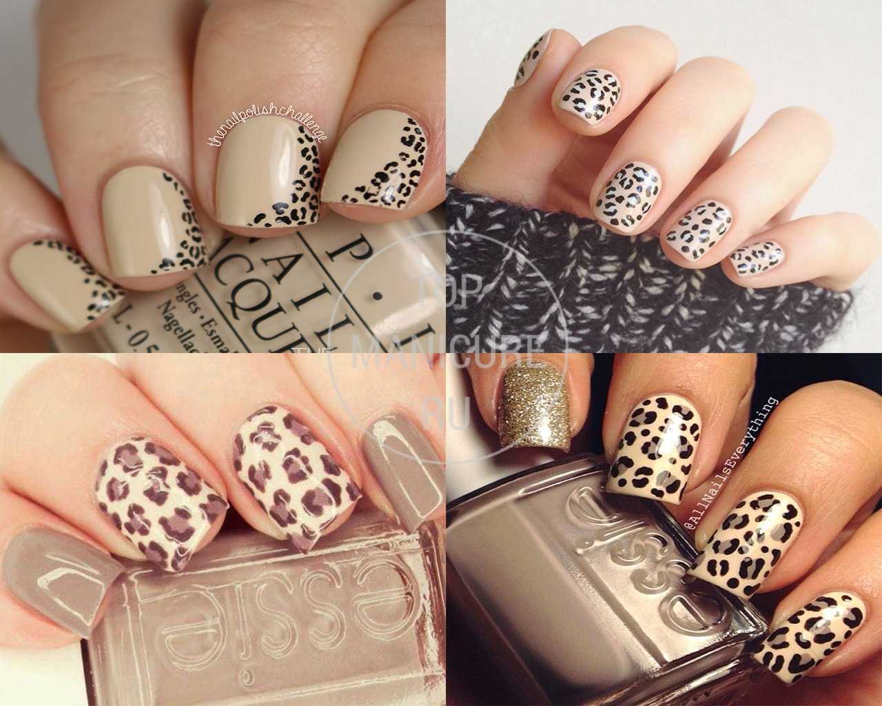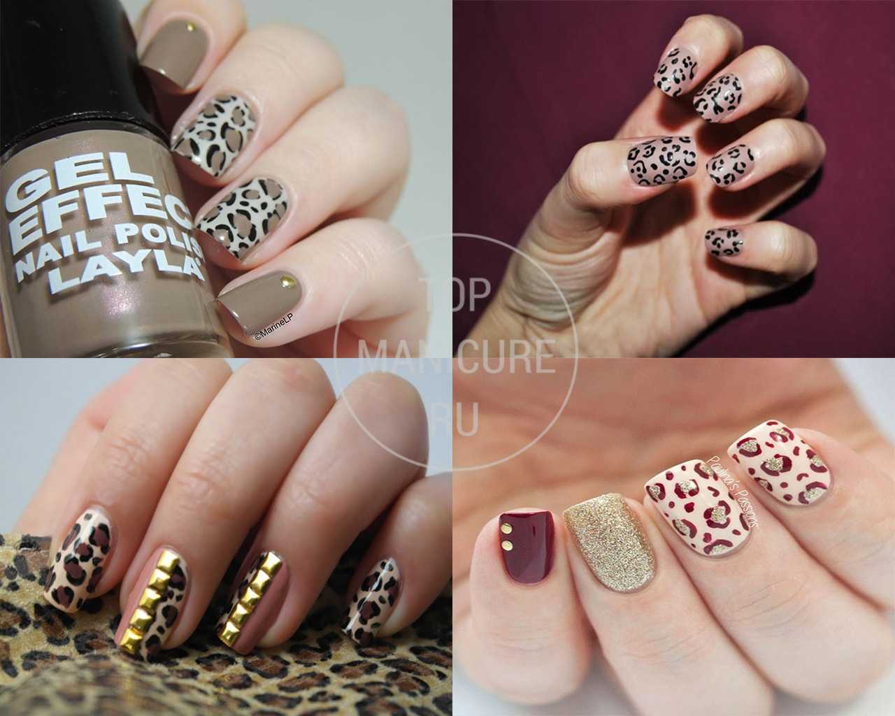 Леопардовый маникюр нюд делается очень просто. Сначала на бежевых ногтях рисуются небольшие пятнышки, можно неровной формы. Затем они обводятся темно-коричневым или черным лаком с помощью тонкой кисти.