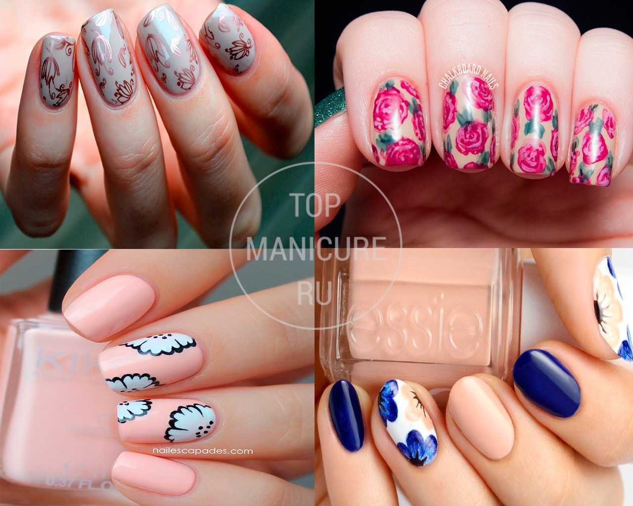 В основном бежевый маникюр с цветами делается с помощью рисования или стемпинга. Цветы, сделанные в технике стемпинге здесь представлены на фото 1. На остальных фото цветы нарисованы кистью. Отлично смотрятся в сочетании с нюдом розовые, белые и синие цветы.