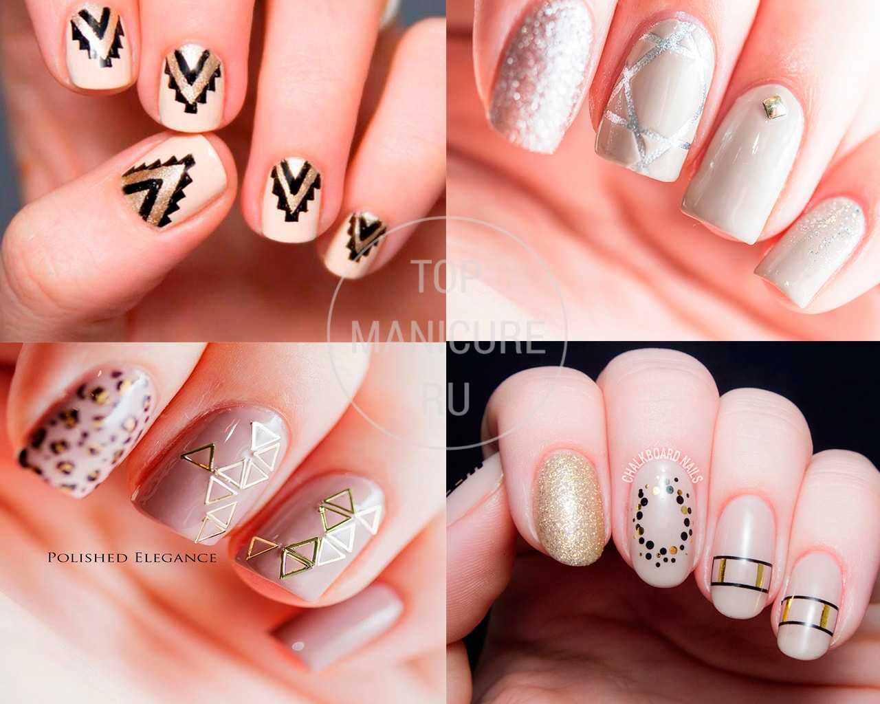 Современный дизайн ногтей с бежевым гель-лаком и геометрическими рисунками