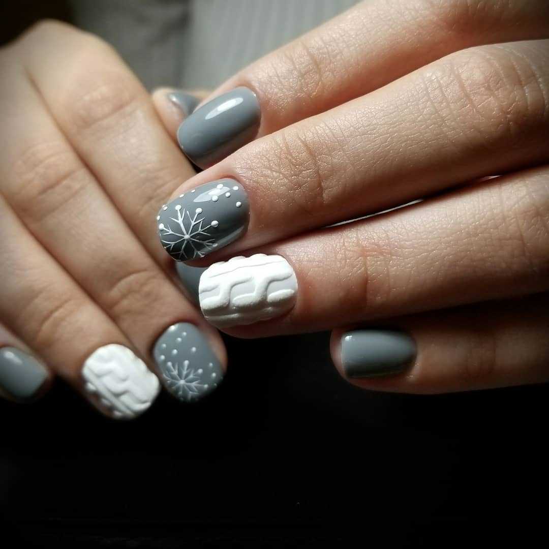 Эффект свитера каждый мастер выполняет по-своему. Одни склоняются к традиционному стилю моделирования. Он заключается в акценте на двух пальчиках: среднем и безымянном. Другие предпочитают всё идеализировать: добавлять нестандартные детали, совмещать косичку с мордашками мультяшных животных, например, медведя или пингвина, делать красивые варежки, уютную шапочку, создавать заснеженный пейзаж, где один пальчик будет иметь вязаный узор.