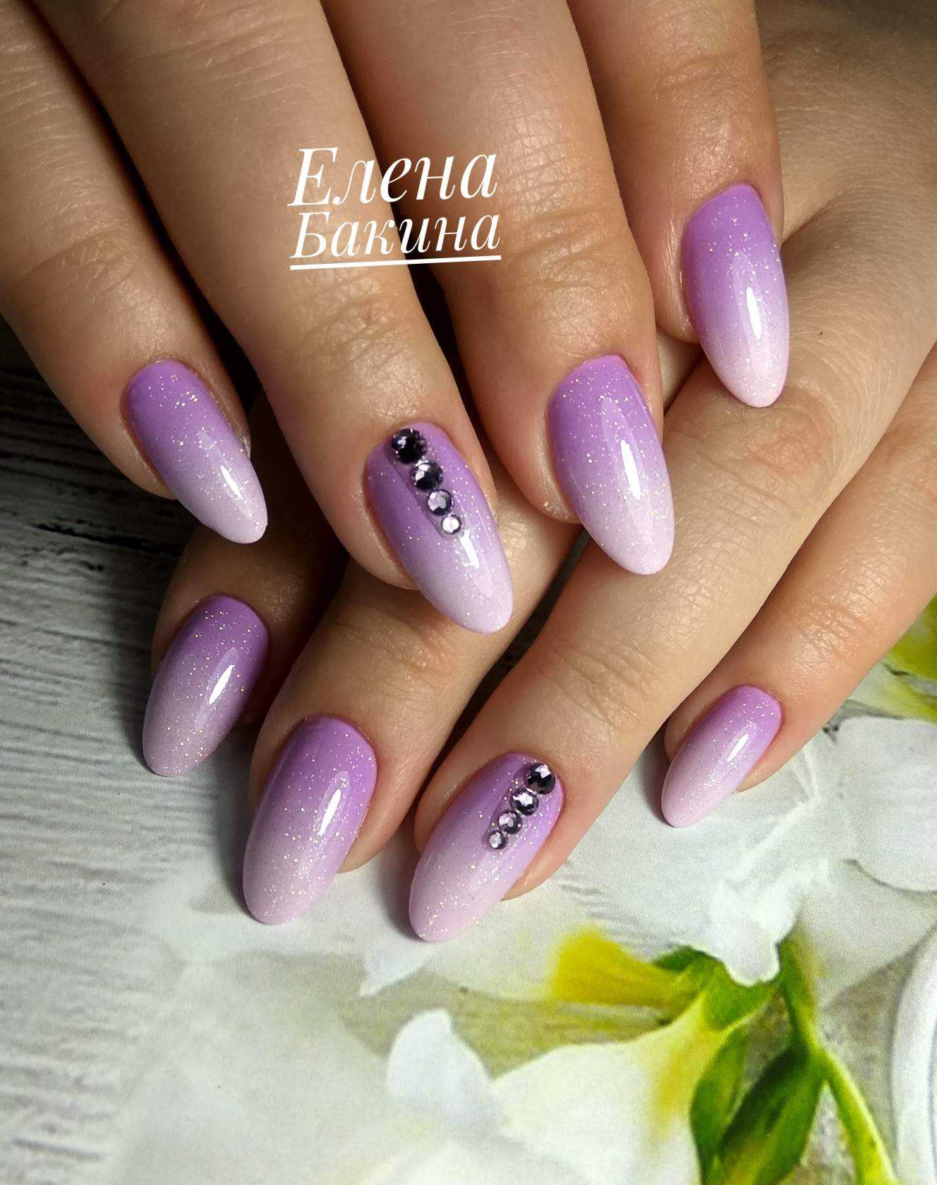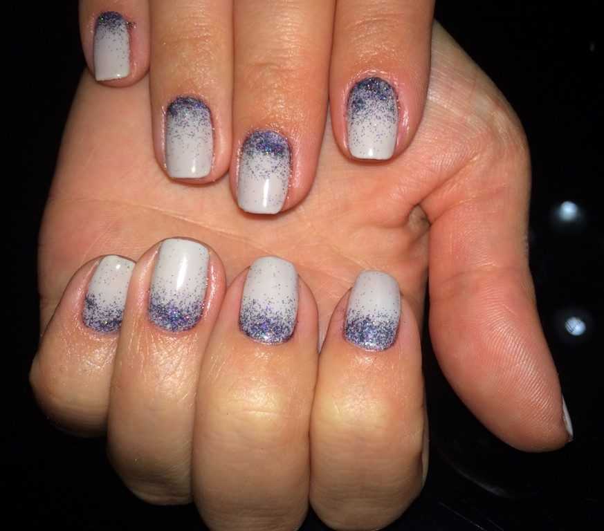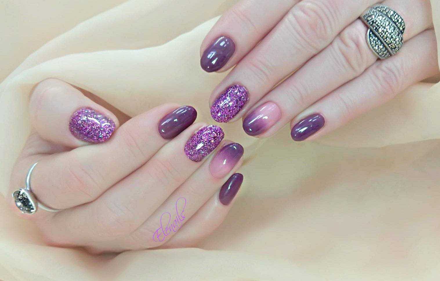 | Блестящий | Переход на таких ноготках осуществляется, не играя степенью насыщенности пигмента, а играя степенью концентрации самих блесток |