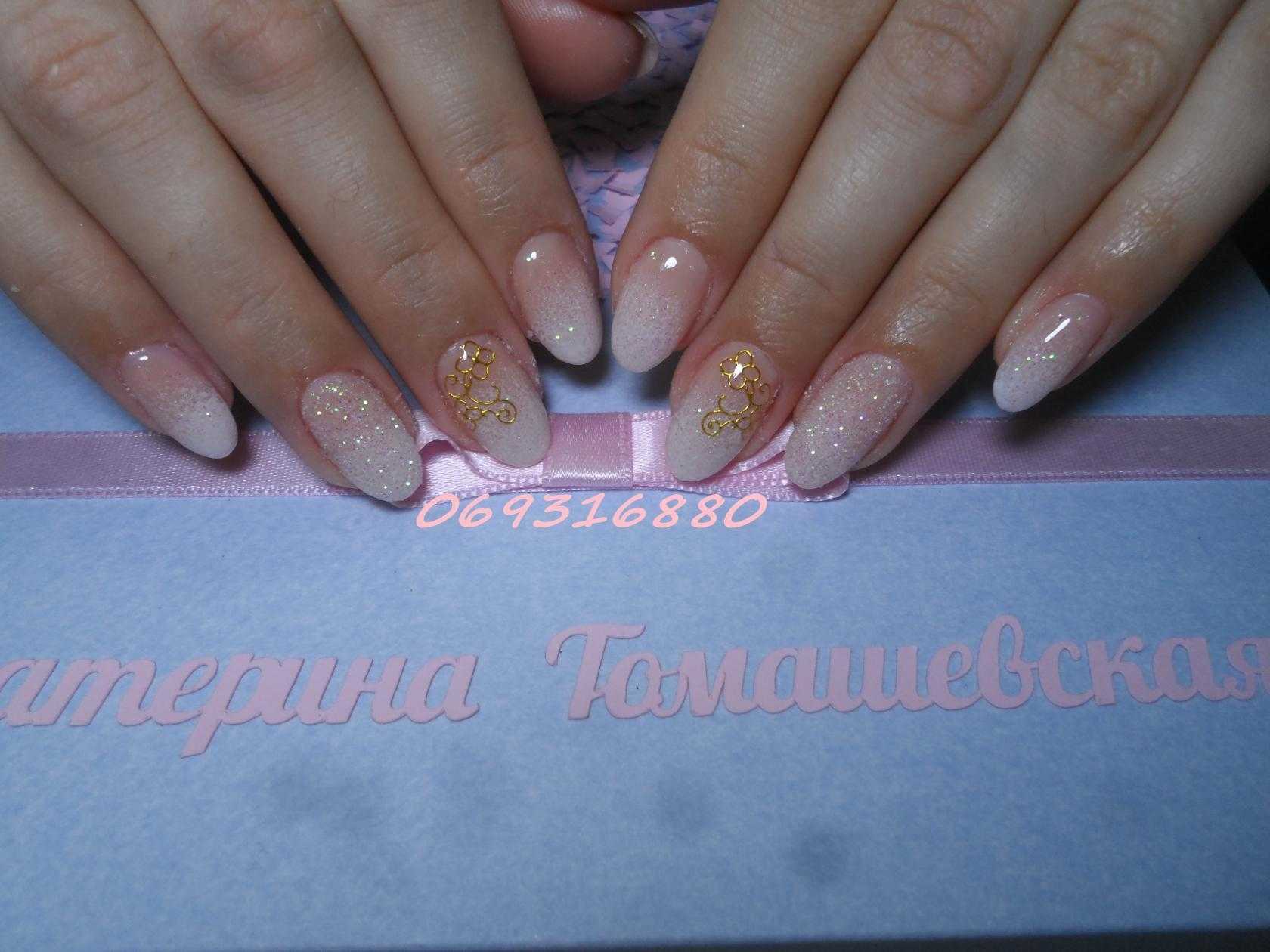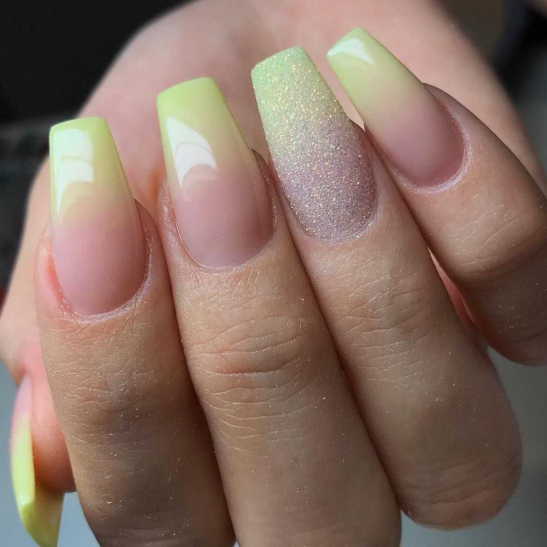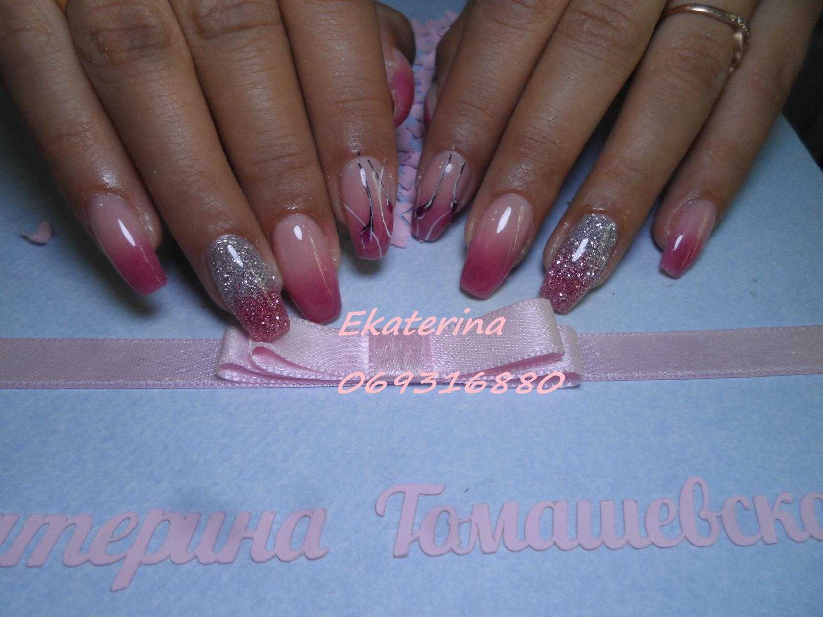 | Блестящий | Переход на таких ноготках осуществляется, не играя степенью насыщенности пигмента, а играя степенью концентрации самих блесток |