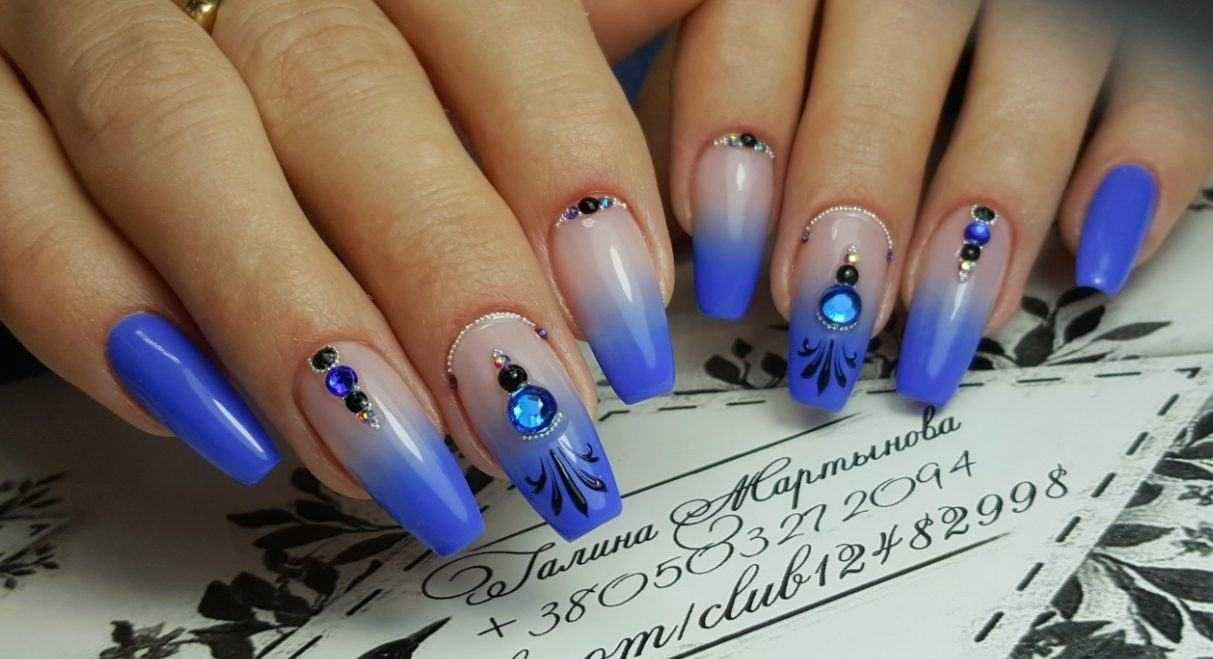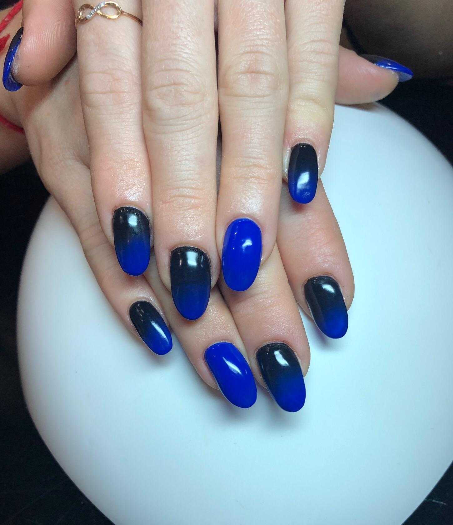 Чтобы создать стильный и привлекательный синий маникюр, совсем не обязательно использовать технику космос. Градиент позволит вам без труда добиться поставленной цели. Формировать образ можно, используя различные оттенки одного цвета.