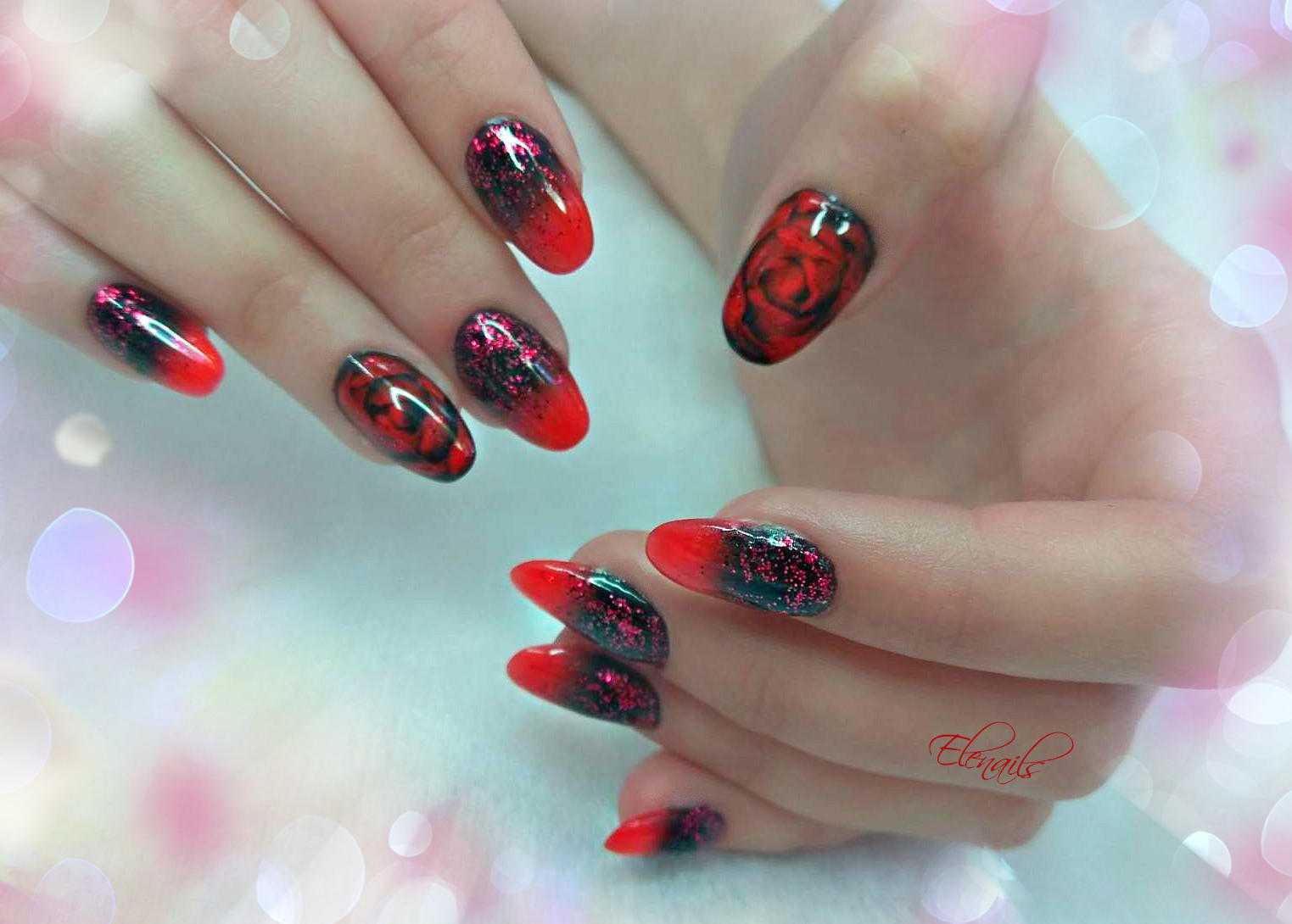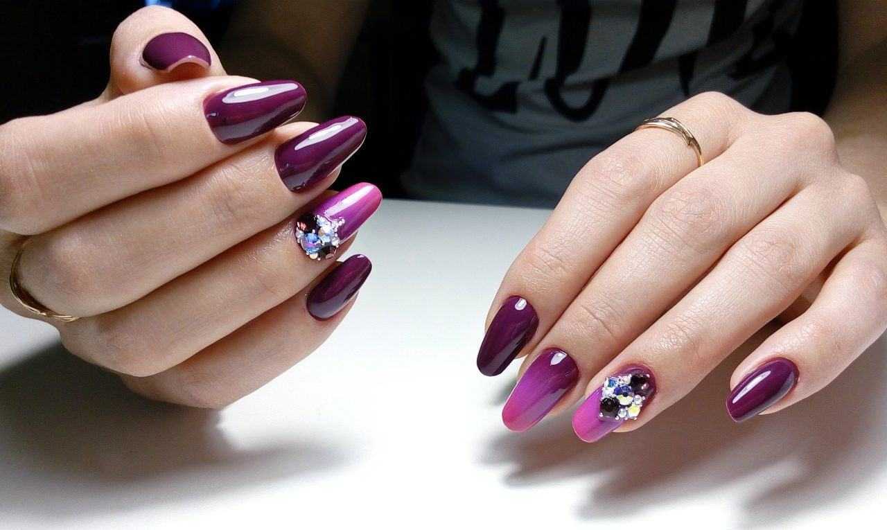 Стильный переход отлично формируется за счет сочетания с черным цветом. Дополнить маникюр можно нежными стразами круглой формы и, например, бордового оттенка.