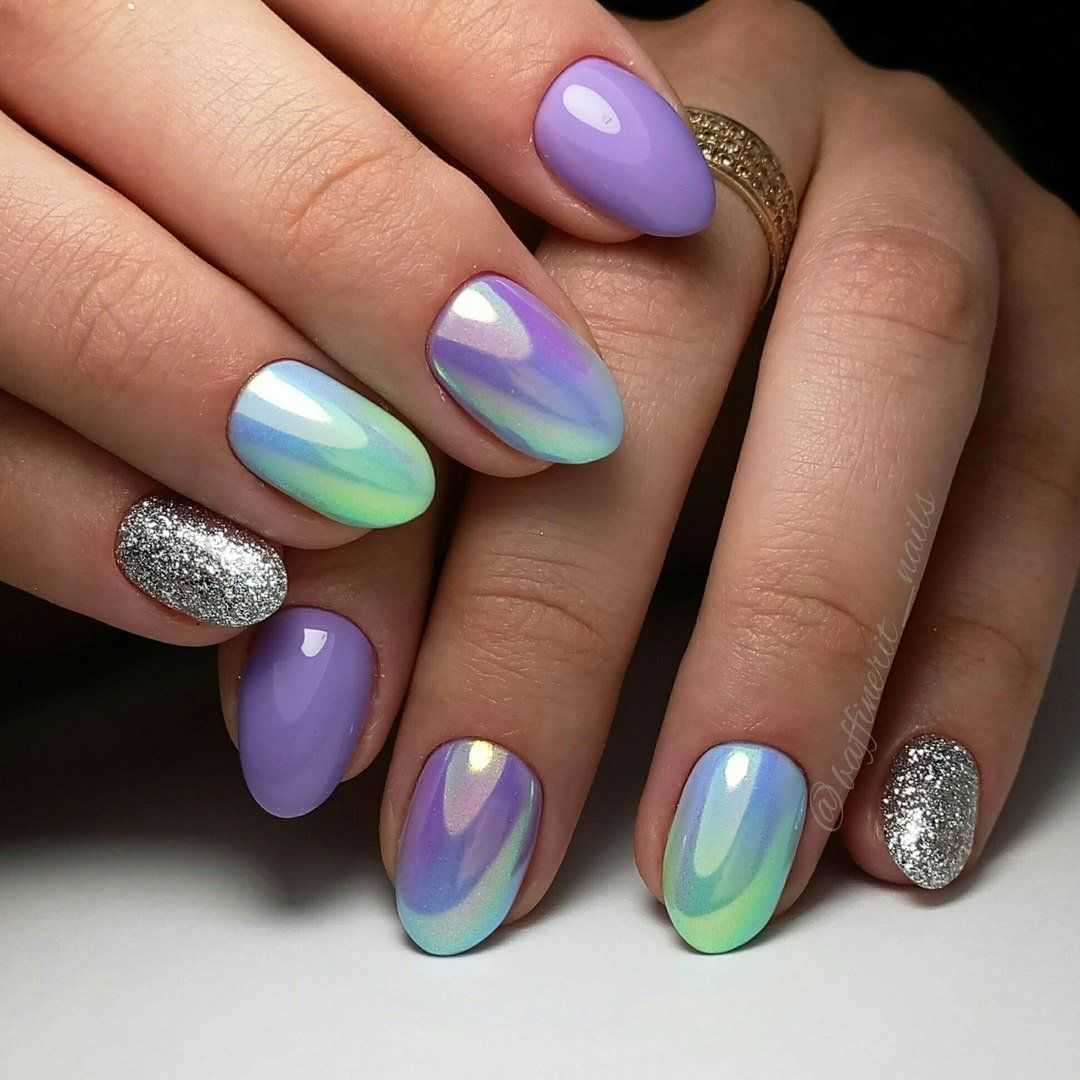 Чтобы у вас не получился своеобразный аквариумный дизайн, старайтесь к лакам с блестками подбирать расходные материалы того же цвета, но без отражающих частиц. Так вам удастся реализовать более успешный и плавный переход.