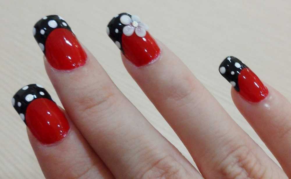 То, о чем говорилось в начале статьи — детали. Именно детали могут сделать даже самый сексуальный маникюр легким и игривым. На фото черно-красный французский маникюр на длинных ногтях, дополненный белыми цветами и кружочками.