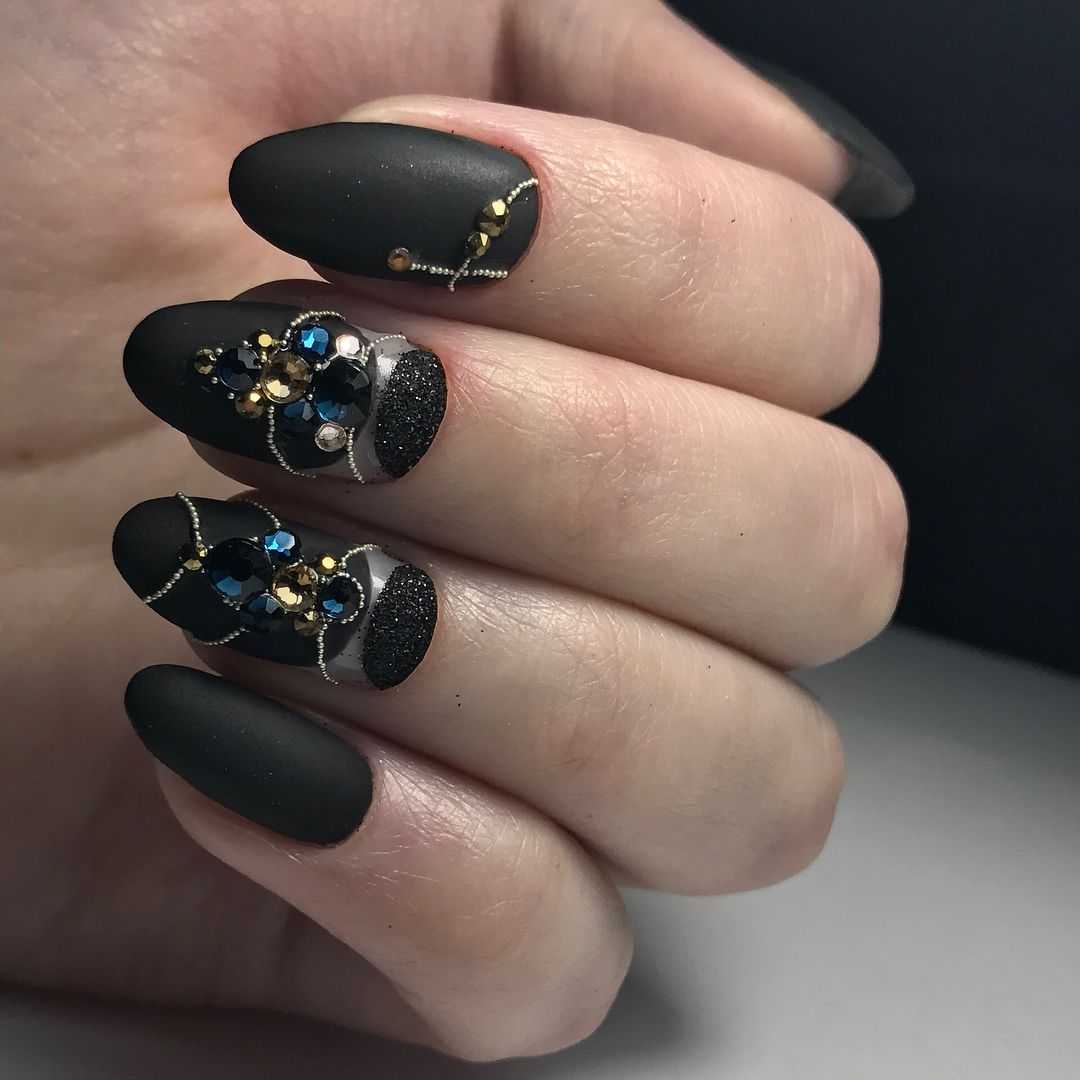 В первую очередь, хотим обратить внимание наших читателей, что чёрный цвет сам по себе очень глубокий и насыщенный, что даёт ему право главенствовать в маникюре. Особенно, если эти качества подчёркиваются мерцанием камней