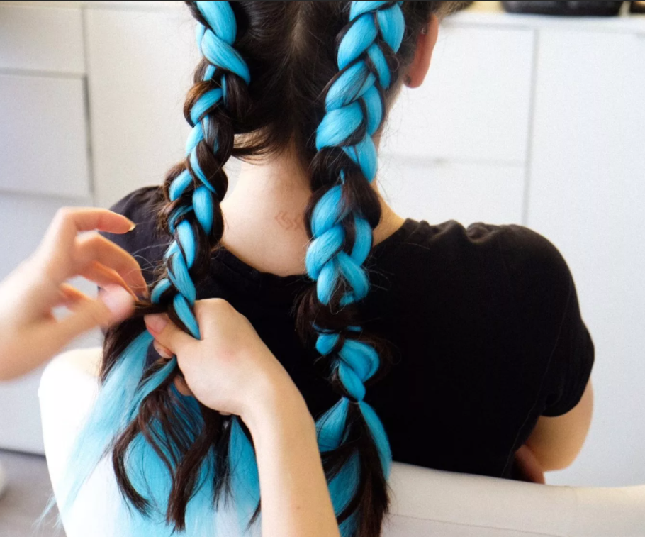 - Плетение выполняют 4 раза, после чего добавляют следующую часть канекалона к крайним локонам.