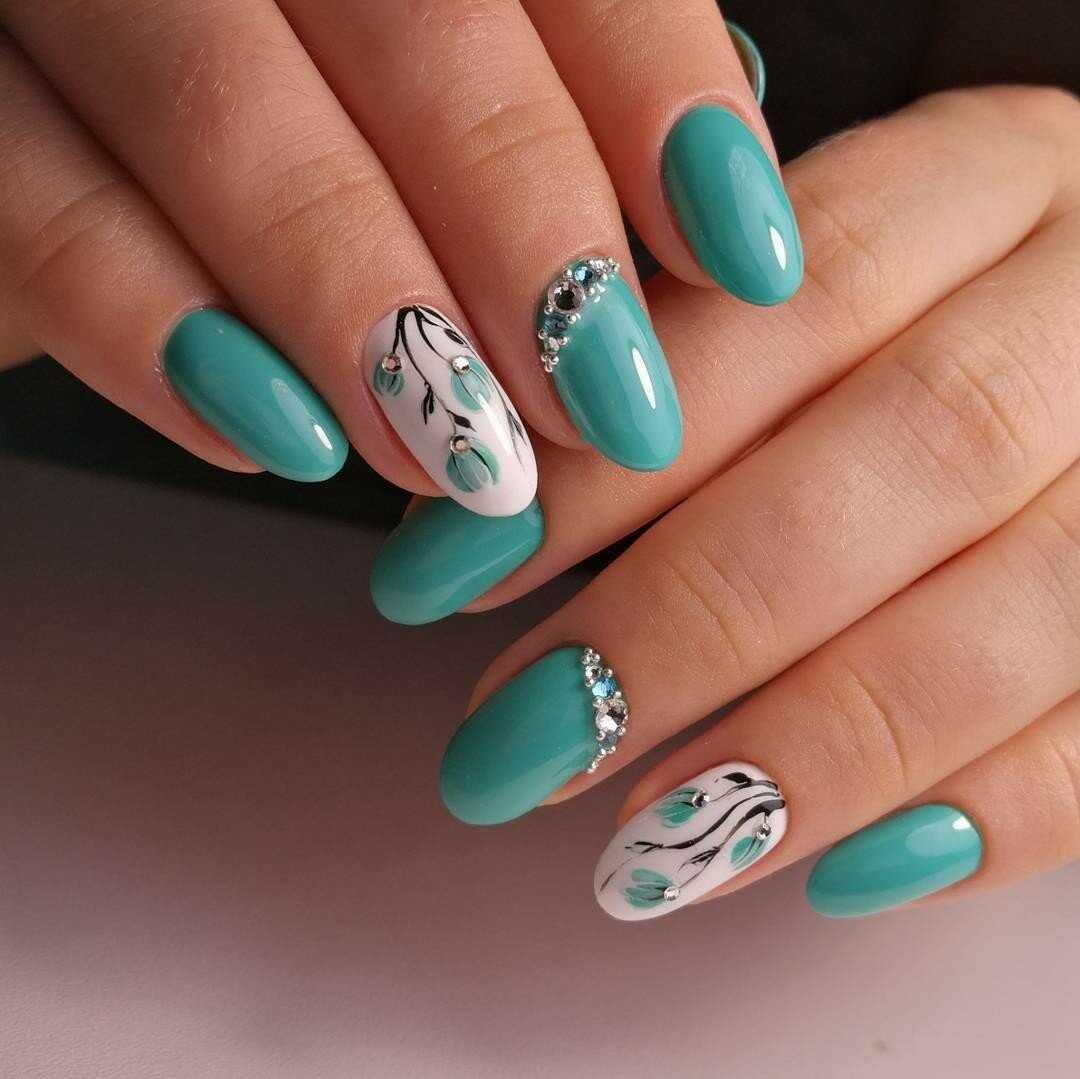 Бирюзово-зеленый дизайн смотрится довольно холодно. Однако палитра зеленого дает возможность подобрать и нежные варианты. Выполнение разными техниками и дополнение яркими украшениями вызовет стойкую ассоциацию с морем, а роскошная инкрустация сделает маникюр изысканным.