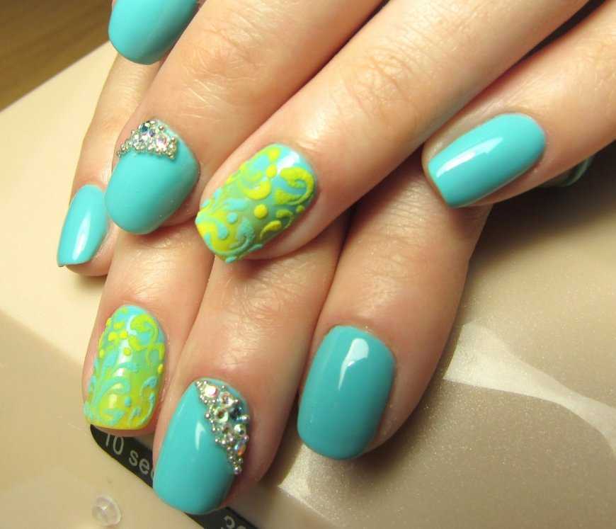 Бирюза и желтый цвет будет выглядеть ярко, однако при желании можно выбрать покрытие приглушенного или пастельного тона. Отлично смотрится летом. Допустима разная форма ногтей и длина. Украшением могут быть цветочные рисунки, полоски, стразы.