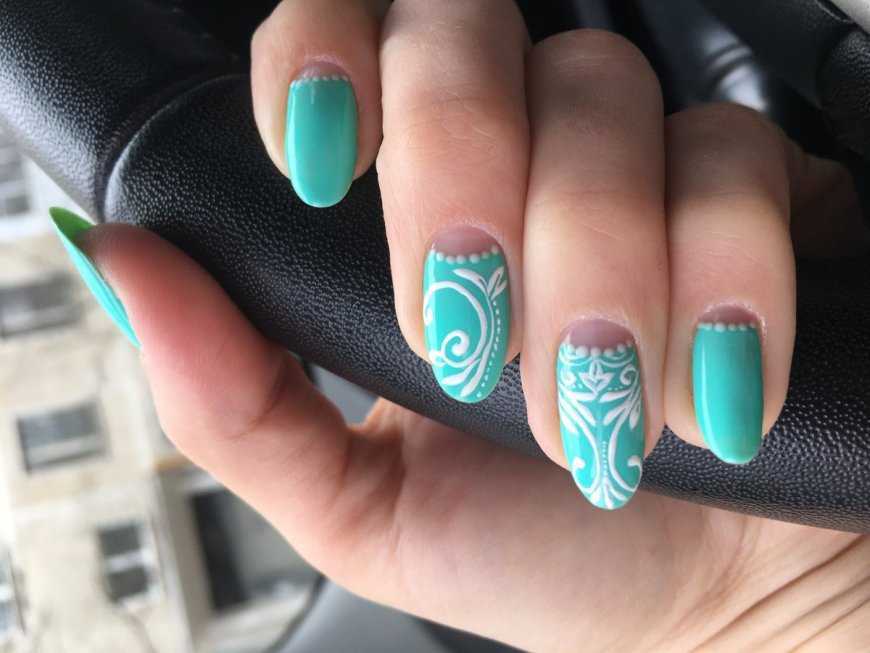 Один из актуальных дизайнов в новом сезоне – маникюр цвета бирюзы в стиле «Тиффани», а особенно в комбинации с белым. Покрытие дополнит аккуратно прорисованные белые линии и рисунки, можно украсить безымянный палец изображением бантика.