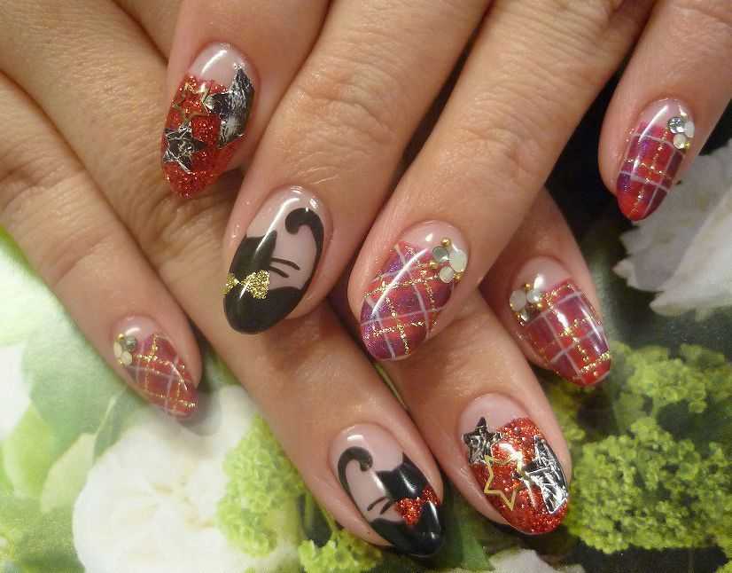 Как подсказывают практики, в большом почете маникюр с черными кошками. И тут пригодится удобное открытие любительниц домашнего маникюра. На готовую цветную основу наносятся изображения гелевой ручкой. Рисовать таким способом намного привычнее, чем кисточкой. Линии получаются четче. Дизайн создается быстрее. Затем художество покрывается закрепителем. Скорее всего, такой способ не одобрят специалисты салона, считая его непрофессиональным. Но результат может быть отличным!