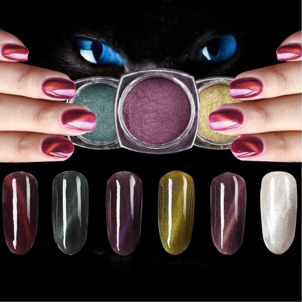 Такой эффект можно создать не только с помощью специального гель-лака. Можно воспользоваться пигментами “Кошачий глаз”.