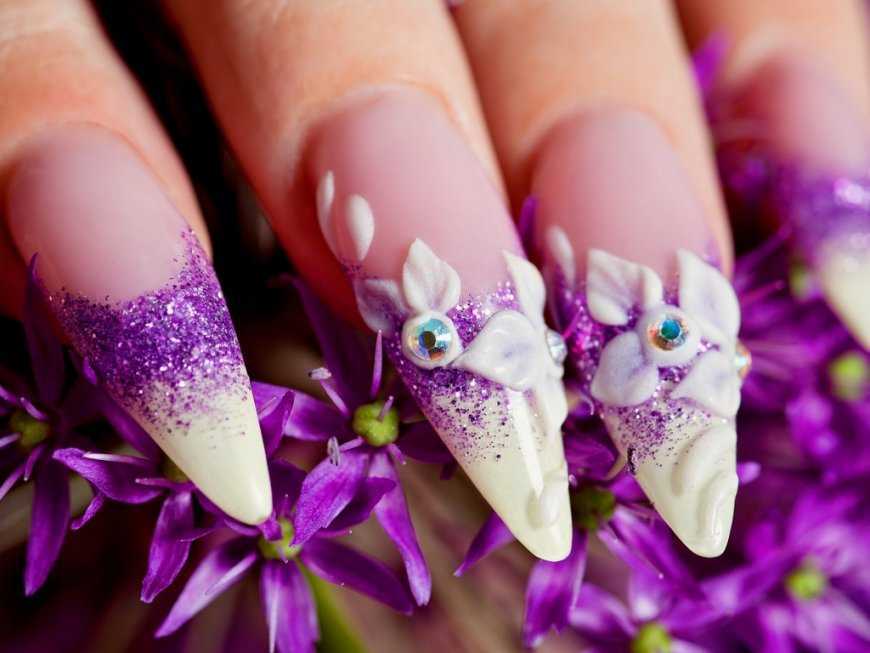 Привлечь его поможет современный 3д маникюр. Можно использовать для этого стразы, бусины, блестки, камни, объемные цветы, бульонки и даже шипы.