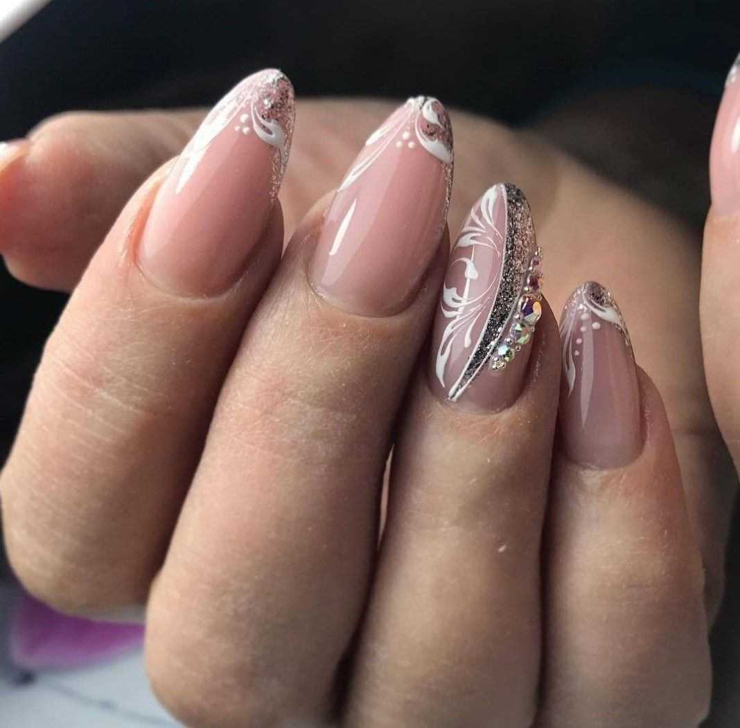 - подходит для любой длины ногтей; — позволяет применять разнообразные декоративные приемы оформления: нанесение узоров, блестки, стразы.