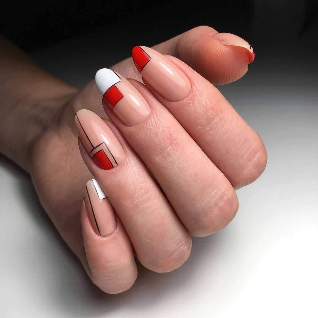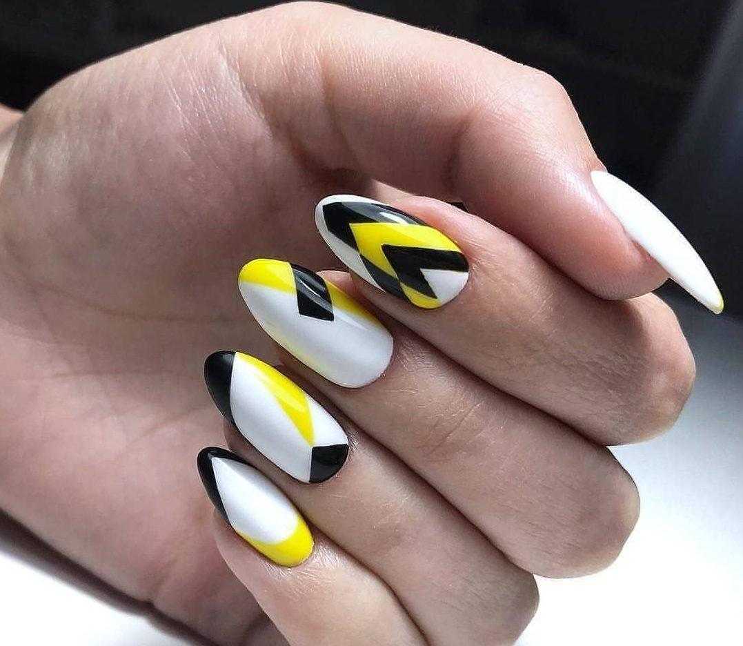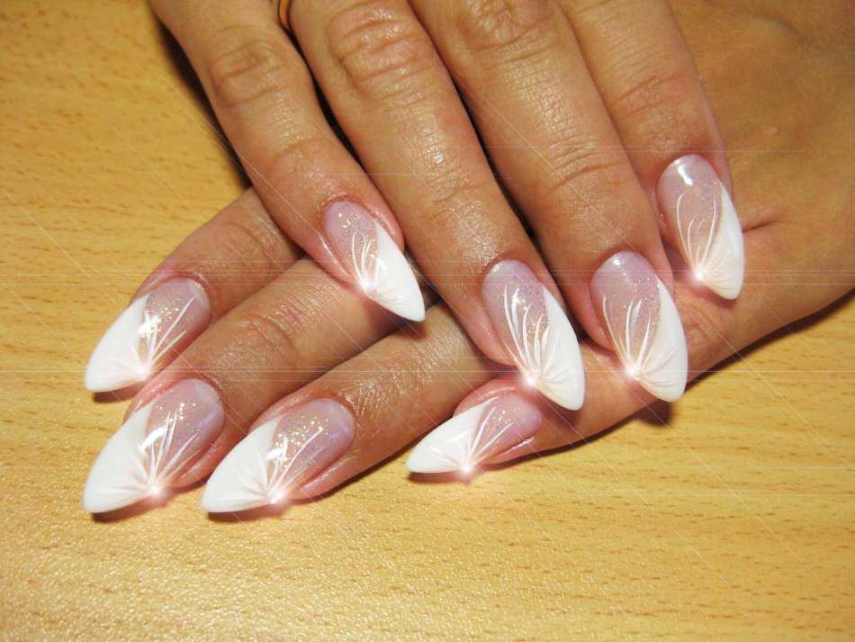 На острых ноготках красиво смотрятся геометрические рисунки. Вы можете оставить большую часть ногтей прозрачной с белой улыбкой, а вот на паре ноготков нарисовать стильные абстрактные узоры.