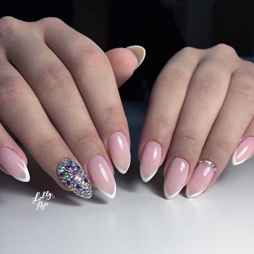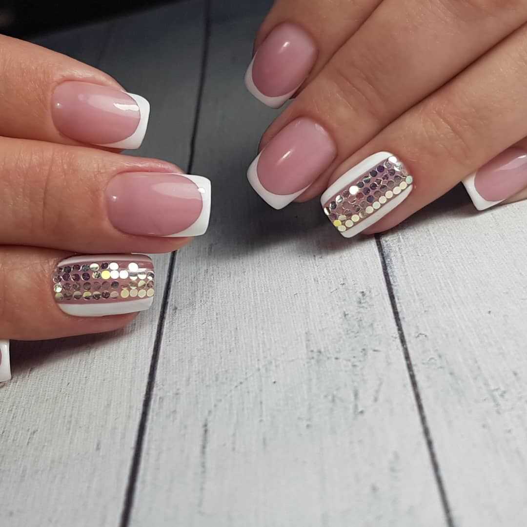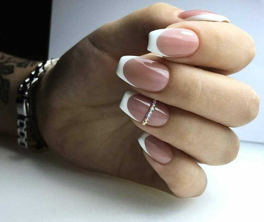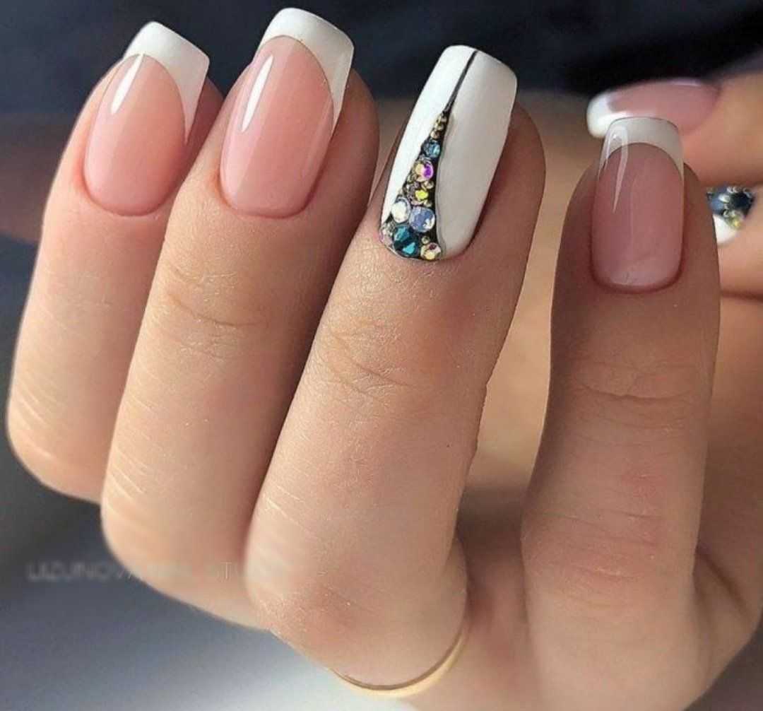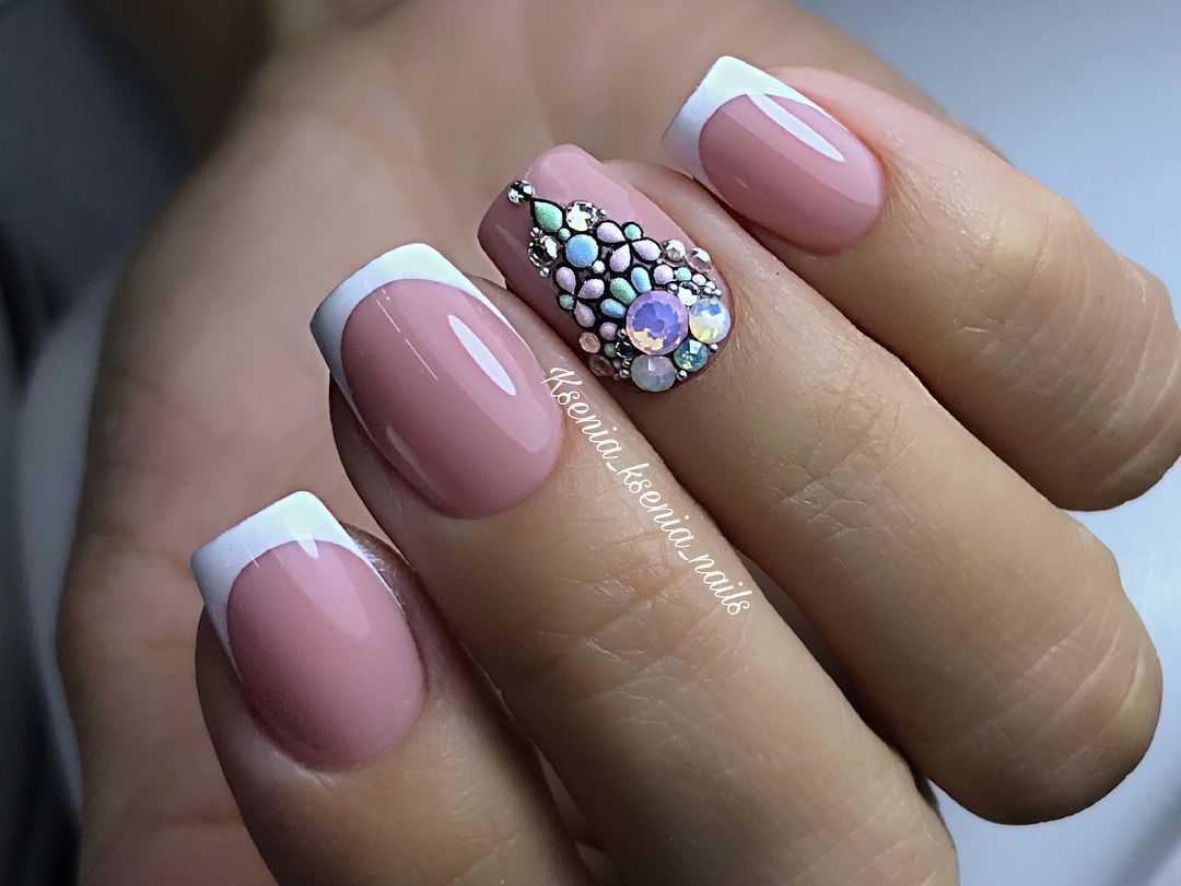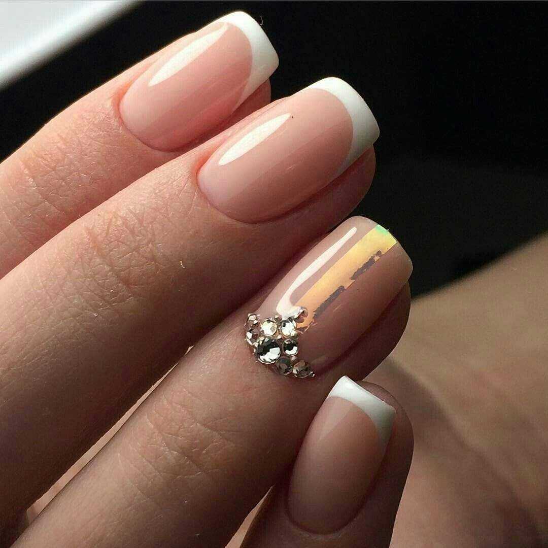 Дополнить классический френч могут декоры, к примеру, небольшие стразы, блески, но декор должен вводиться взвешенно, аккуратно.