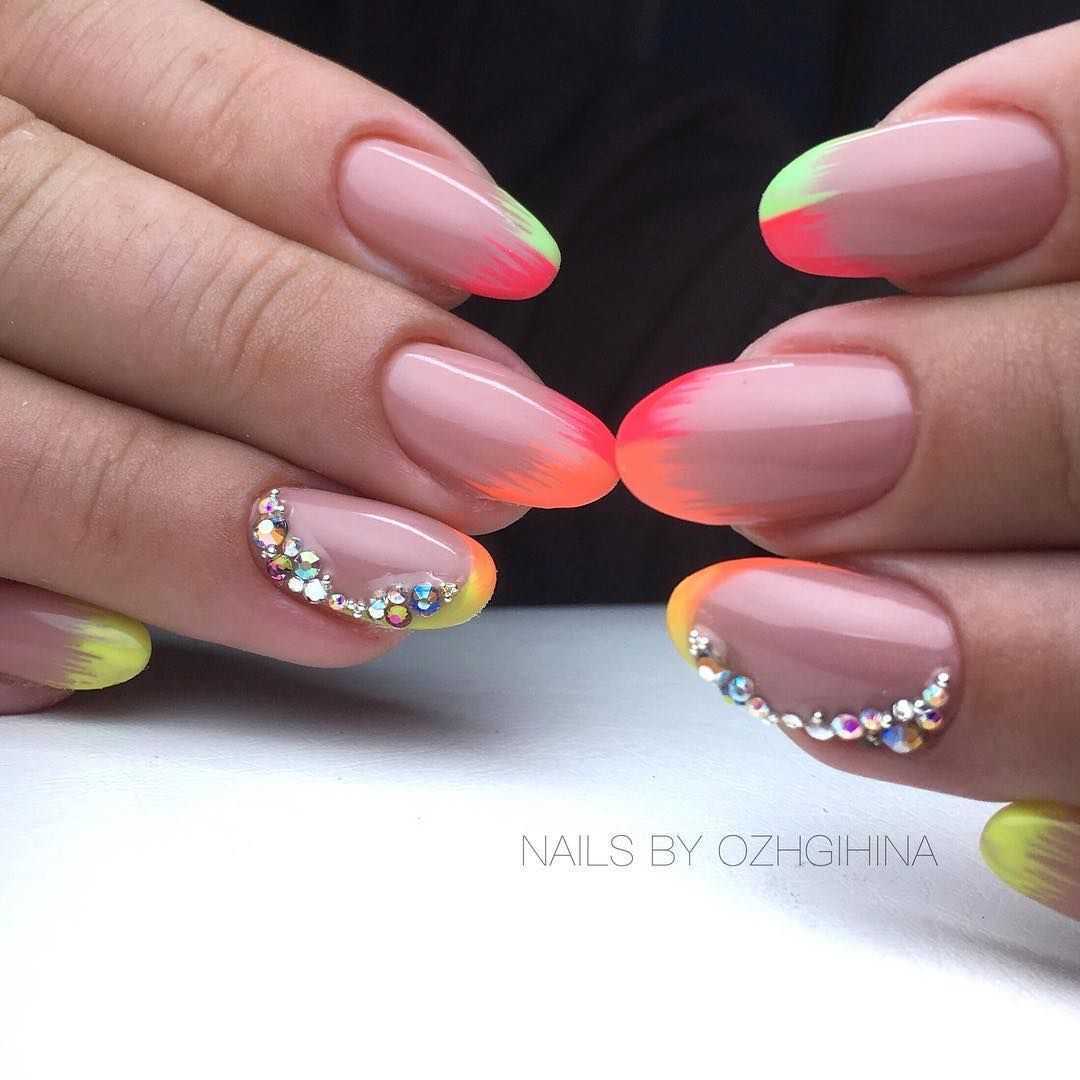 Примерьте образ «все в одном». Здесь и френч, и омбре, и матовые ногти, и даже стразы. С таким маникюром точно нечего делать в офисе или на деловой встрече — вперед, на вечеринку или на рейв!