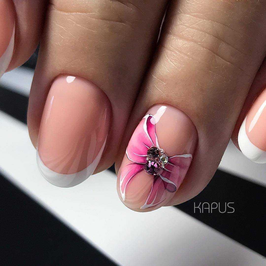 Дополнив френч с цветами стразами, маникюр приобретет яркости и изысканности. Таким декором можно даже имитировать цветочки. Очень часто украшают камешками серединку бутона или лепесточки.