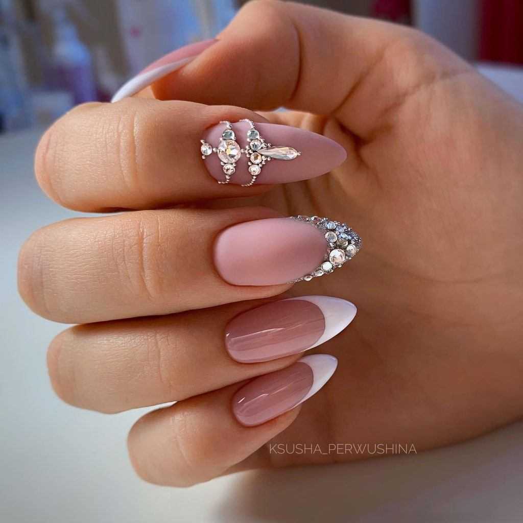 Матовый френч в таком цветовом исполнении подчёркивает загар и очень притягательно смотрится. Декор из жемчужин, камней, лёгкие рисунки из акриловой пудры придадут нотку яркости в нежный и женственный образ.