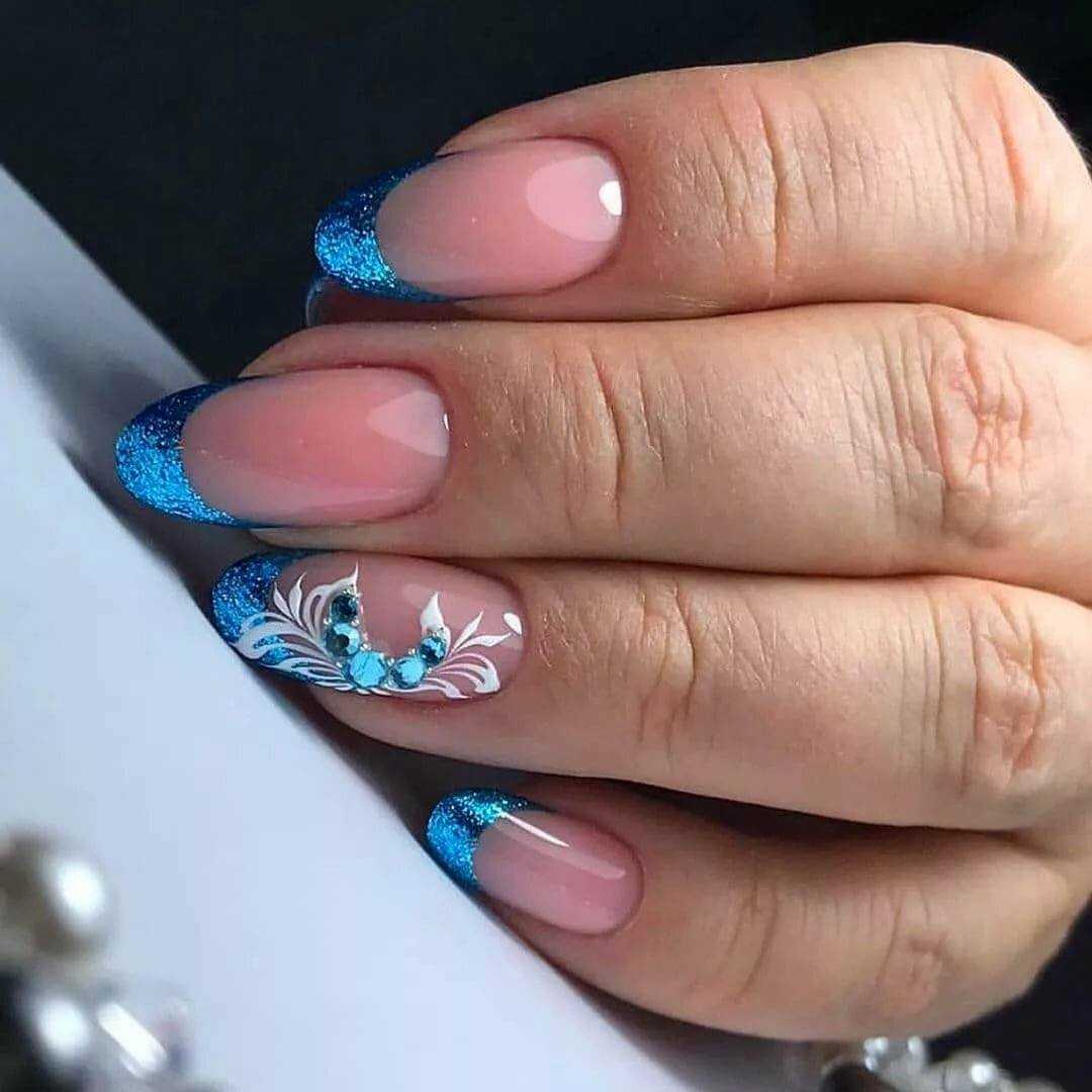 Вариации сиреневого и бирюзового благоприятно скажутся на настроении и замечательно подойдут для романтической встречи. На пальчиках с бледной кожей выгодно и очень романтично смотрится классический френч оттенка «розовое золото». Стильно выглядят молочно-белые или зеленые торцы ногтя, украшенные стразами.