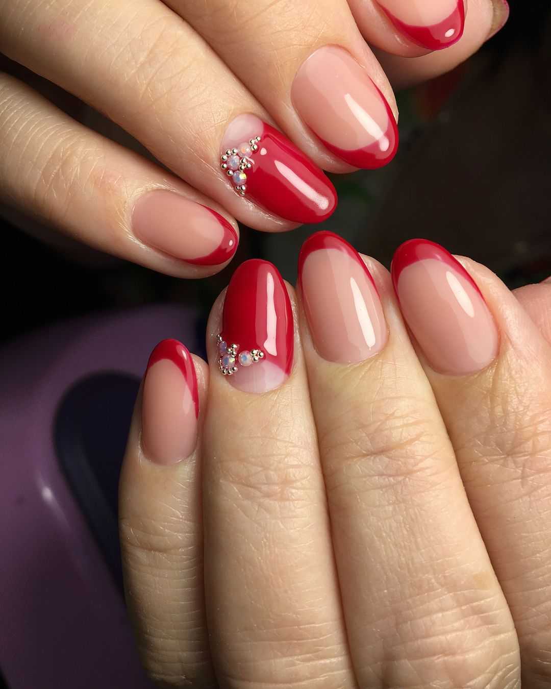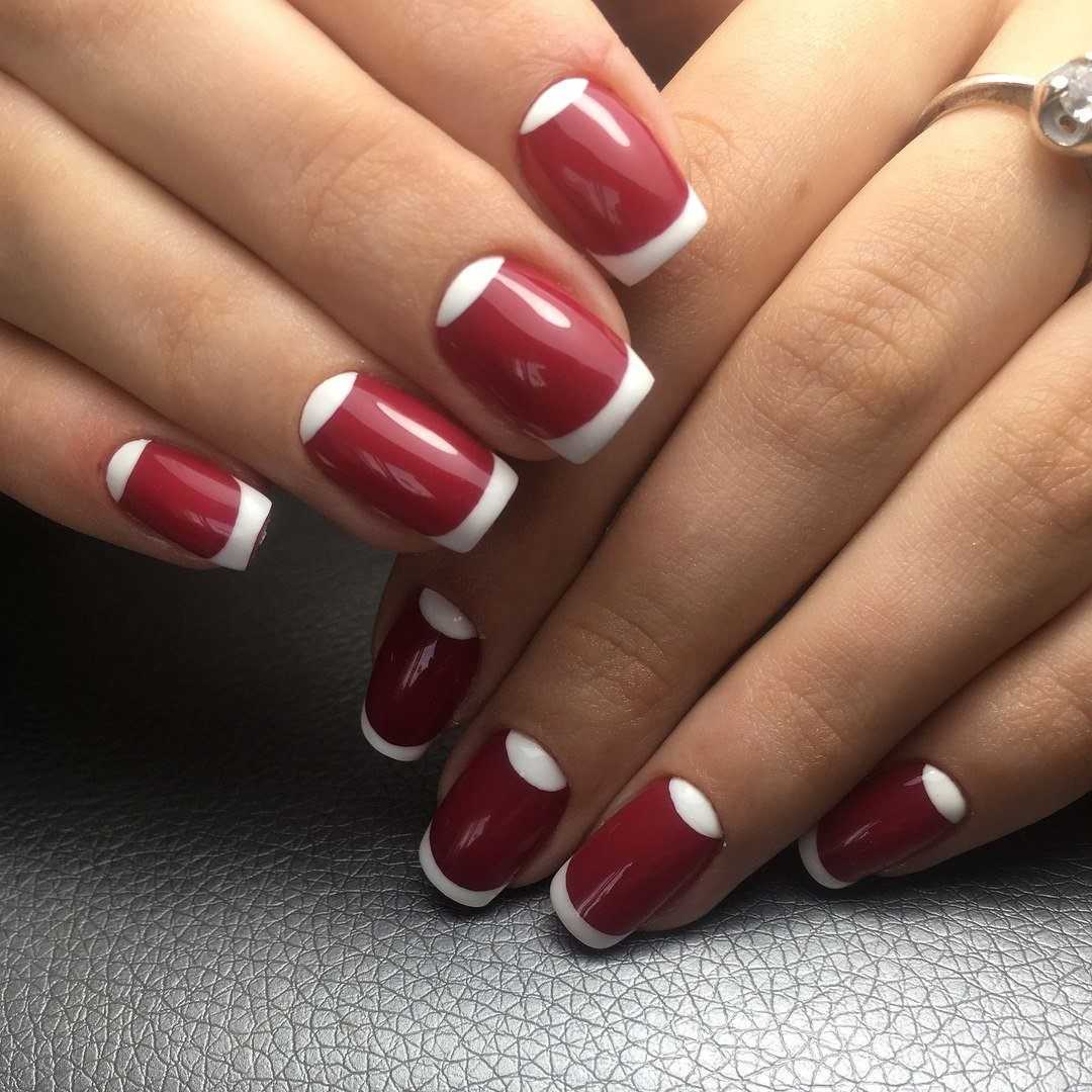 Это наиболее изящный и стильный из всех видов красного френча. Его особенность заключается в том, что характерная окантовка в виде полумесяца располагается не на кончике ногтя, а у его основания.